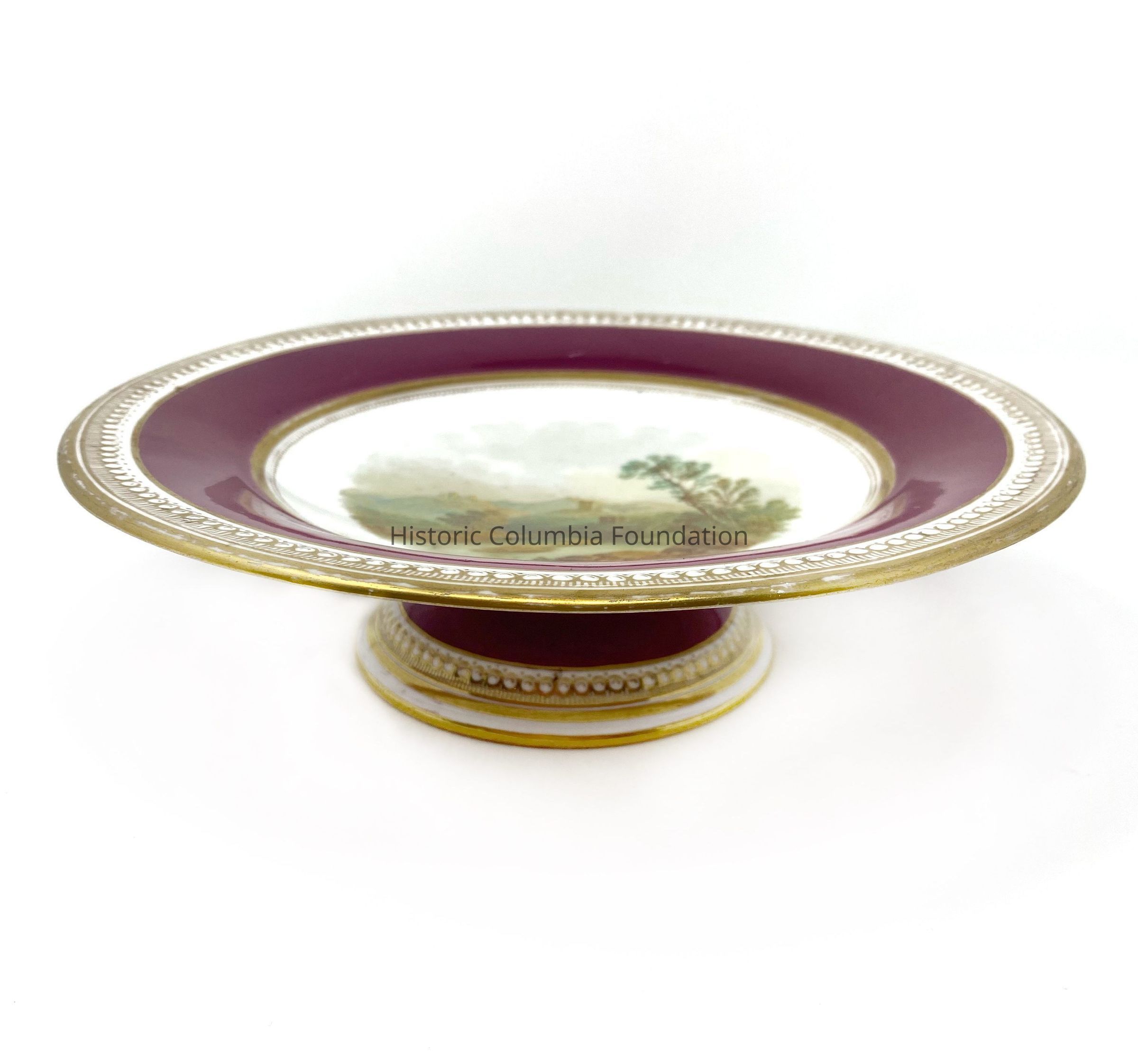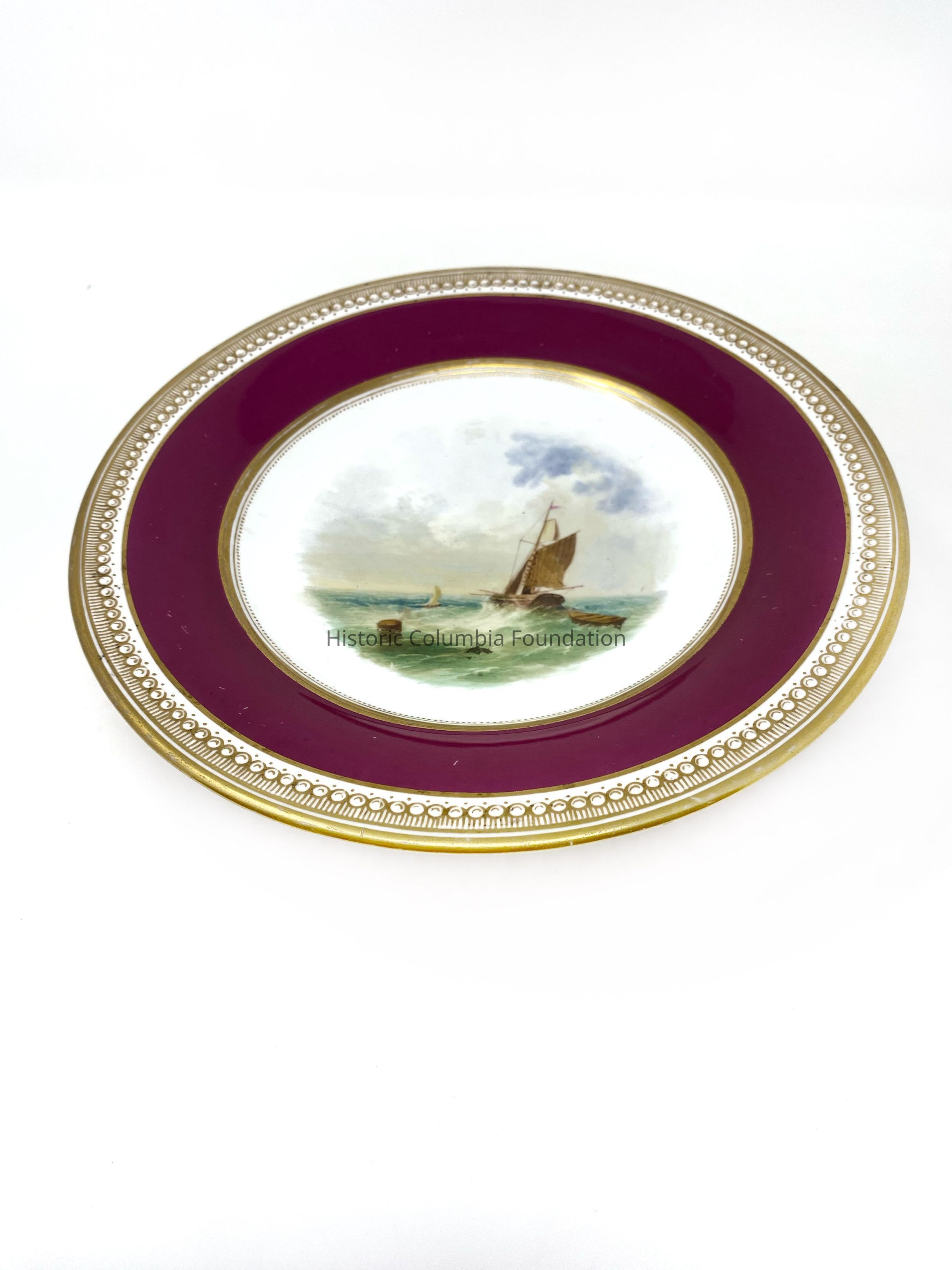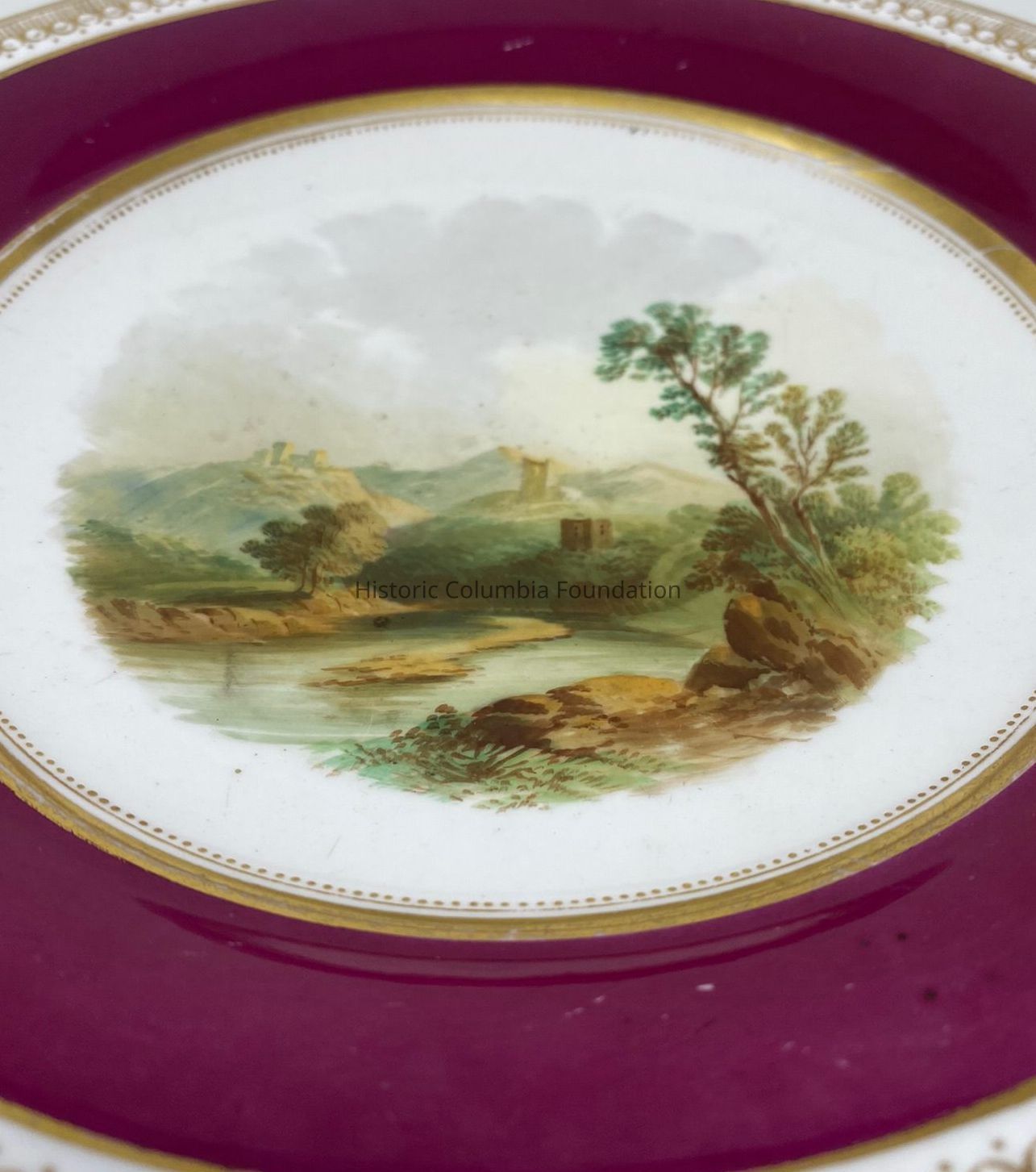 Three years after saving the Robert Mills House from demolition, former Historic Columbia president Jennie Dreher (1916–2006) purchased this dinnerware set as part of a larger initiative to refurbish the house. As a result, these dishes have been on display in the historic house museum since 1967 and have been featured in period rooms and a focus gallery highlighting late-18th- through mid-19th-century ceramics. Dining ware like this—with a deep red ground and gold embellishments surrounding a land or seascape design—was commonly seen in the mid- to late-1800s.Dimensions