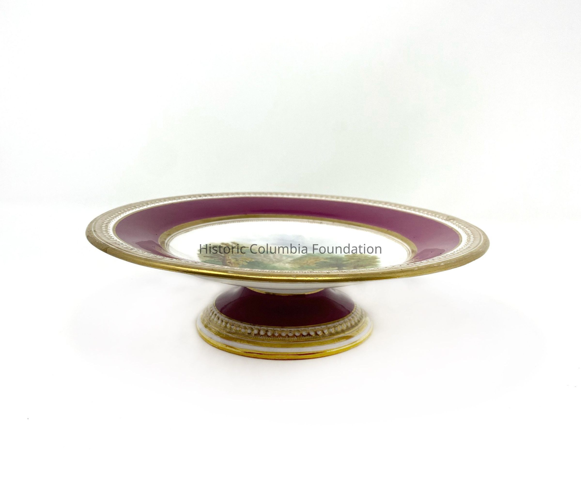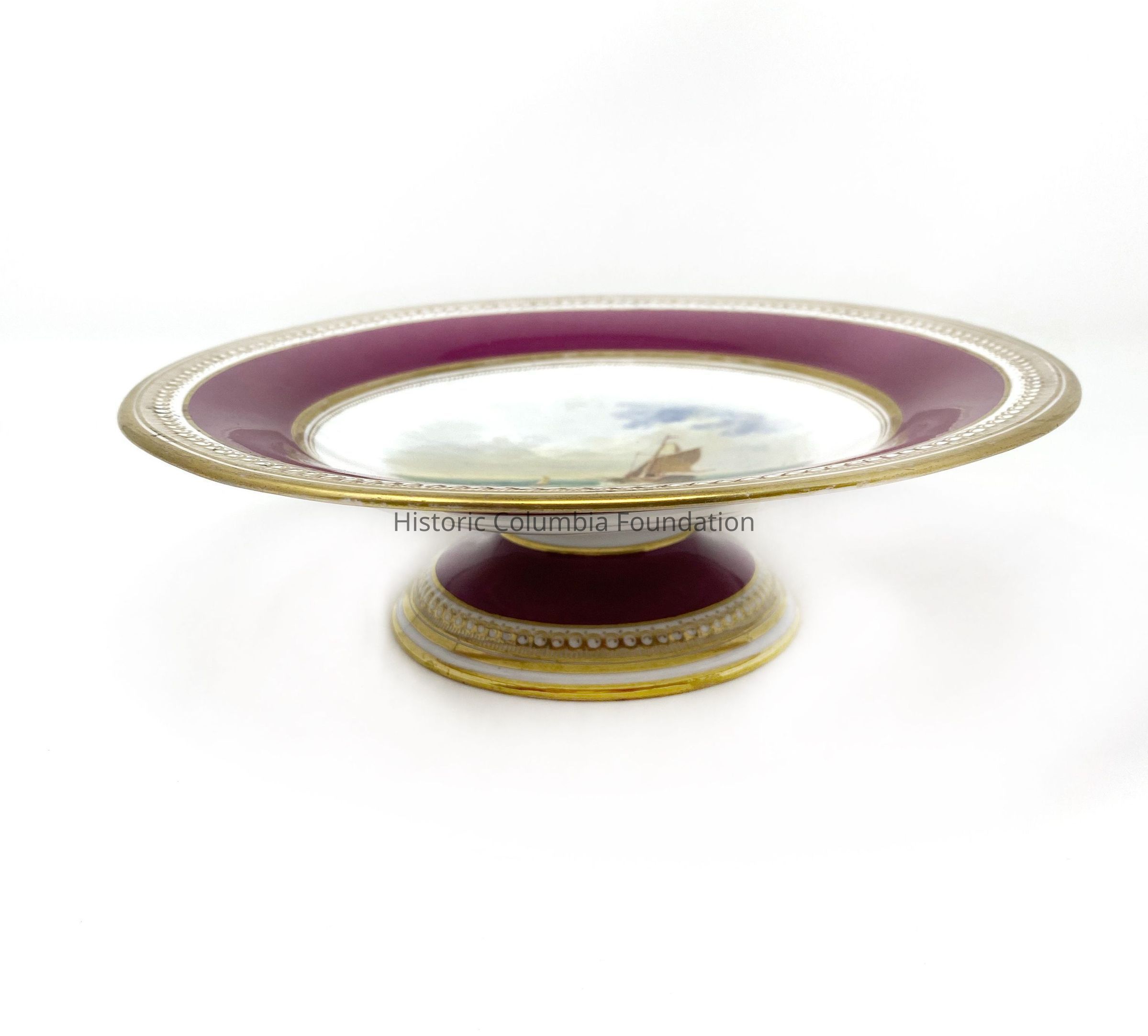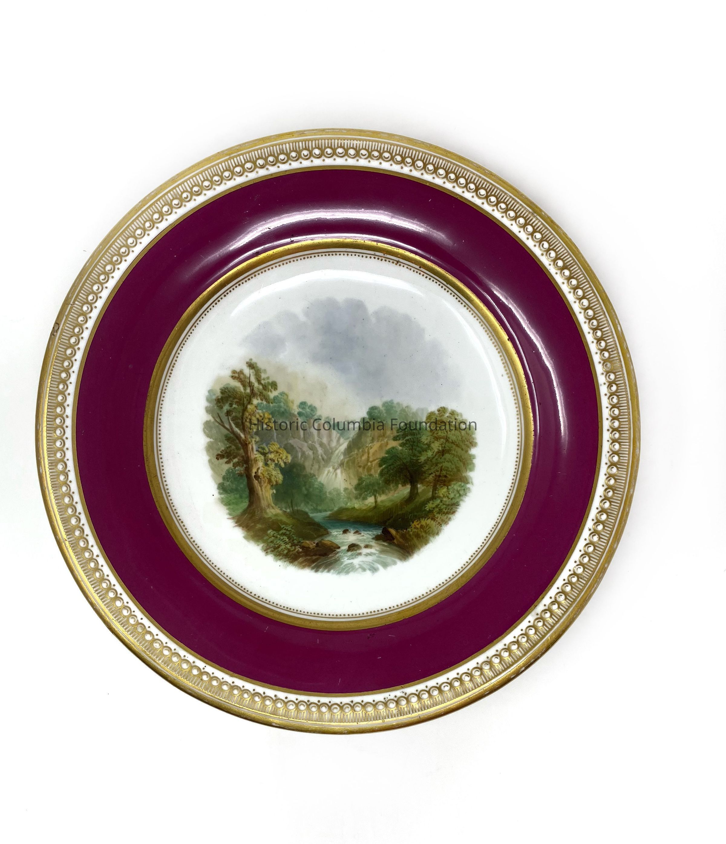 Three years after saving the Robert Mills House from demolition, former Historic Columbia president Jennie Dreher (1916–2006) purchased this dinnerware set as part of a larger initiative to refurbish the house. As a result, these dishes have been on display in the historic house museum since 1967 and have been featured in period rooms and a focus gallery highlighting late-18th- through mid-19th-century ceramics. Dining ware like this—with a deep red ground and gold embellishments surrounding a land or seascape design—was commonly seen in the mid- to late-1800s.Dimensions