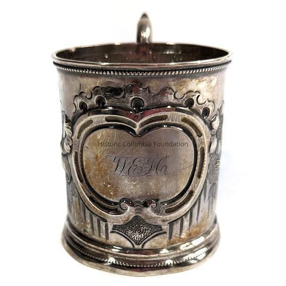 Southern coin silver cup with beaded rim. Most of the cup is smooth. The side of the cup opposite the handle features a floral chased cartouche with engraved initials "WEH." The underside is marked with a fleur-de-lis overstruck with maker's mark "J. Veal" inside a rectangle.Context