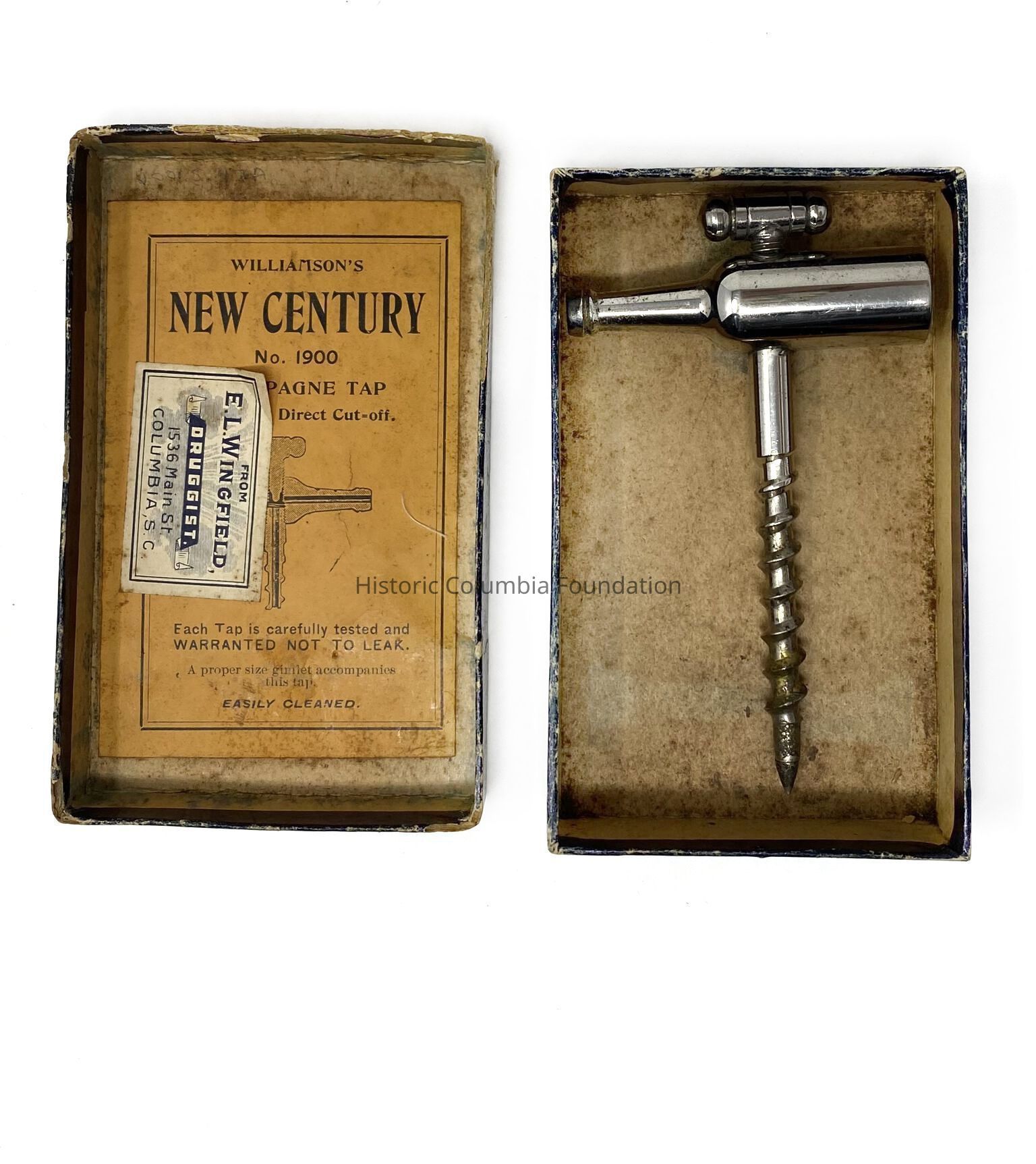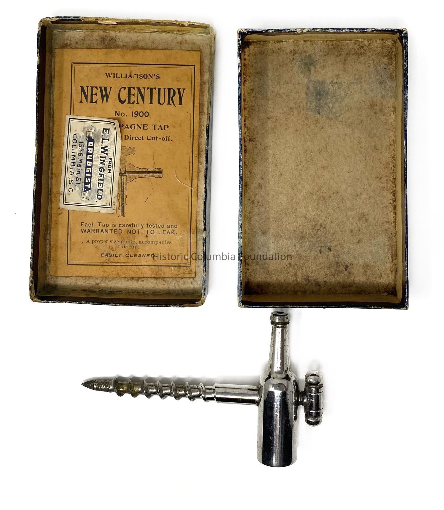 This particular champagne tap was sold by Dr. Emmet Lee Wingfield (1872-1936), who operated a drug store at 1536 Main Street in Columbia from 1900 until 1914. Although labeled as “easily cleaned,” it is unclear whether this tap was ever used.Made/Created