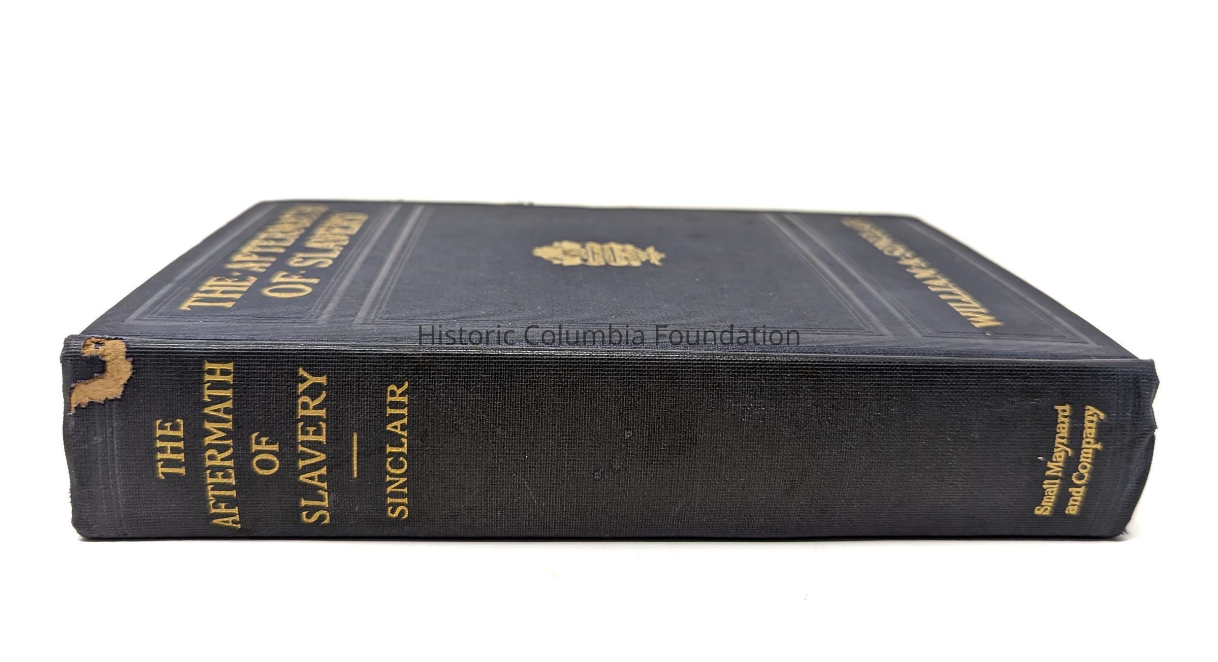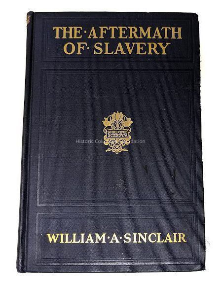 Dark navy blue-covered book with the title , "The Aftermath of Slavery," in gold embossed font on the front cover. The author's name, William A. Sinclair, appears in the same manner, along with a depiction of stylized flowers and the publisher's motto: "SCIRE QUOD SCIENDUM." The spine also lists the title and the last name of author, as well as the publisher, Small, Maynard and Company. Pages of book are cut unevenly and have ragged edges.Context