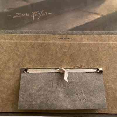 The center of the objects features a print of a white woman with brown hair staring into the distance as the moonlight reflects off a body of water behind her. In the bottom lefthand corner of the image, it includes the name "Zula Kenyon." The image is surround by a dark brown mat, and just below it the paper backing includes the title, "Over There."