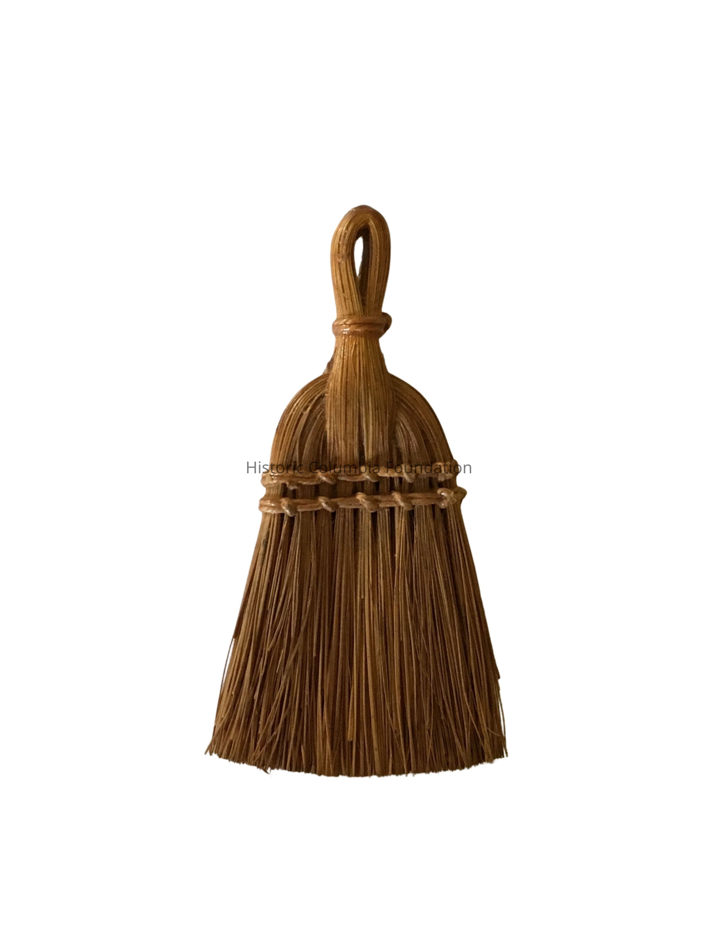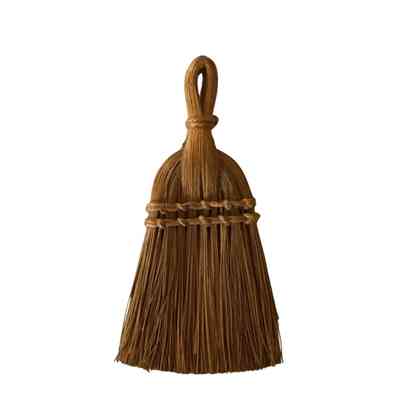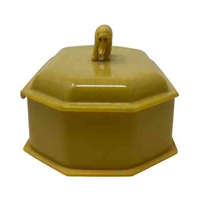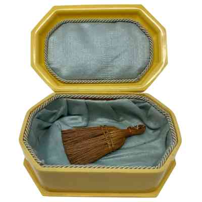 Yellow celluloid trinket box with an elephant on the lid. The box has eight sides and sits on four ball feet. The inside of the box is lined with blue satin and edged in blue rope. It contains a tiny broom.Made/Created