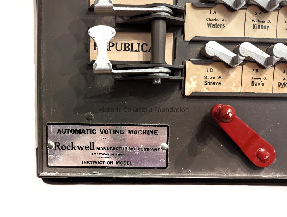 Instructional machines like this one familiarized voters on how to operate an actual automatic voting machine (AVM) in order to avoid mistakes on Election Day. In general, voting machines like this were superior in comparison to a ballot box; AVMs kept a running count of votes, while totaling votes in ballot boxes could take hours to days. Additionally, an AVM could be locked by poll officials, reducing the chance of voter fraud.