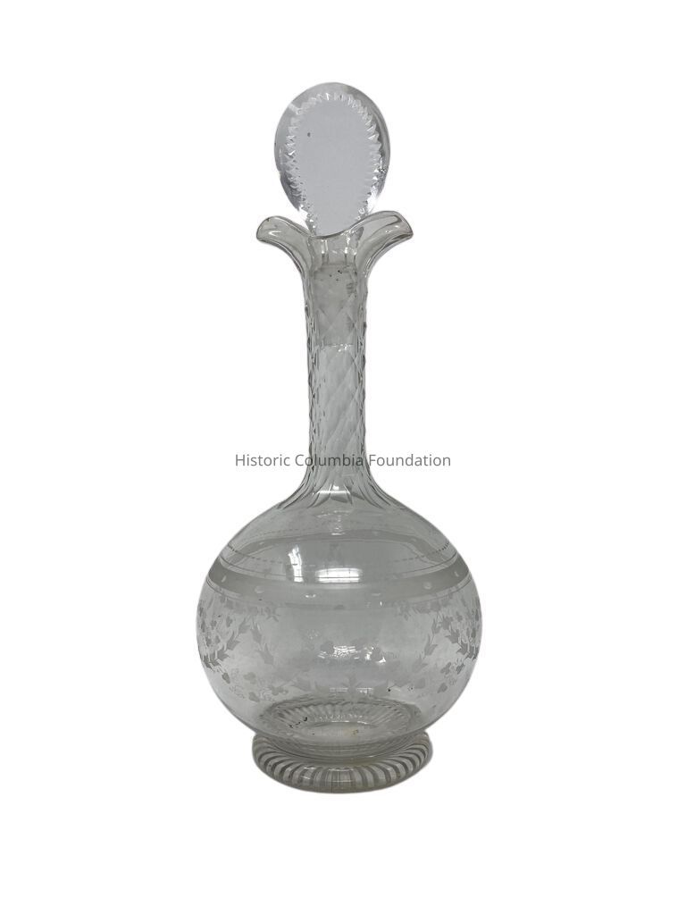 Decanters are used to store and serve alcohol. Popular drinks in the late 1700s included madeira, port, whiskey, cider, and rum-based punch mixtures. Wealthier individuals often had their own distilleries and wineries on their properties which were operated by enslaved labor. Alcohol consumption was common at all meals, including breakfast, and the average person consumed over three-and-a-half gallons of alcohol per year.