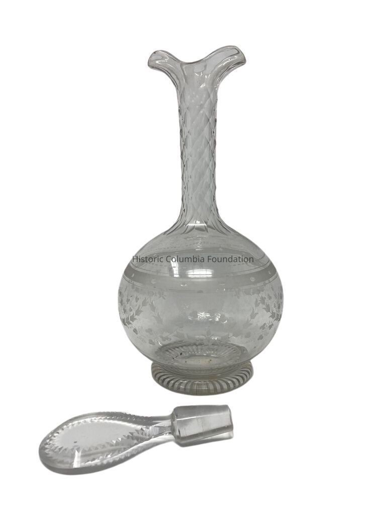 Leaded glass decanter. It has a ring foot decorated with a reverse miter cut. Its spherical reservoir has two delicate acid-etched garlands—one grape, one floral. Above the garlands is a wide acid-etched band with a cut oval design. It has a diamond cut neck which contains an inverted tear drop stopper with a cut saw tooth design and a double spout lip.