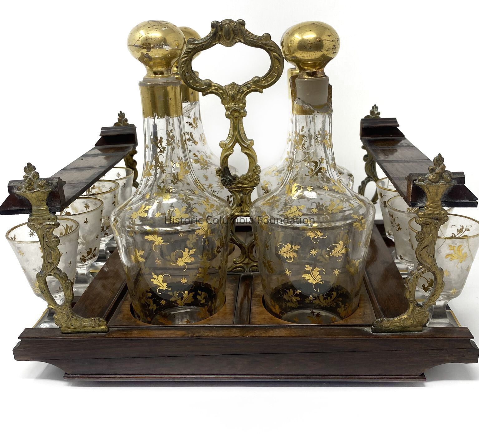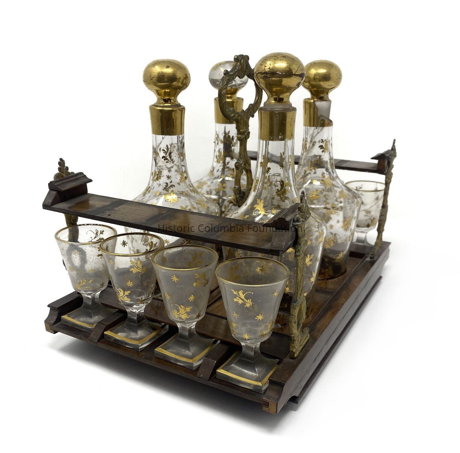 After his father’s death in 1858, Hampton III inherited both substantial property and substantial debt. Although most of Hampton III’s wealth—comprised of or built by the people he enslaved—was lost during and after the Civil War, he remained an influential part of state and national politics until his death. As the main Hampton family homes in Columbia, including Hampton III's Diamond Hill, were burned during the Civil War, it's possible this decanter set came from Wild Woods in Mississippi.Dimensions