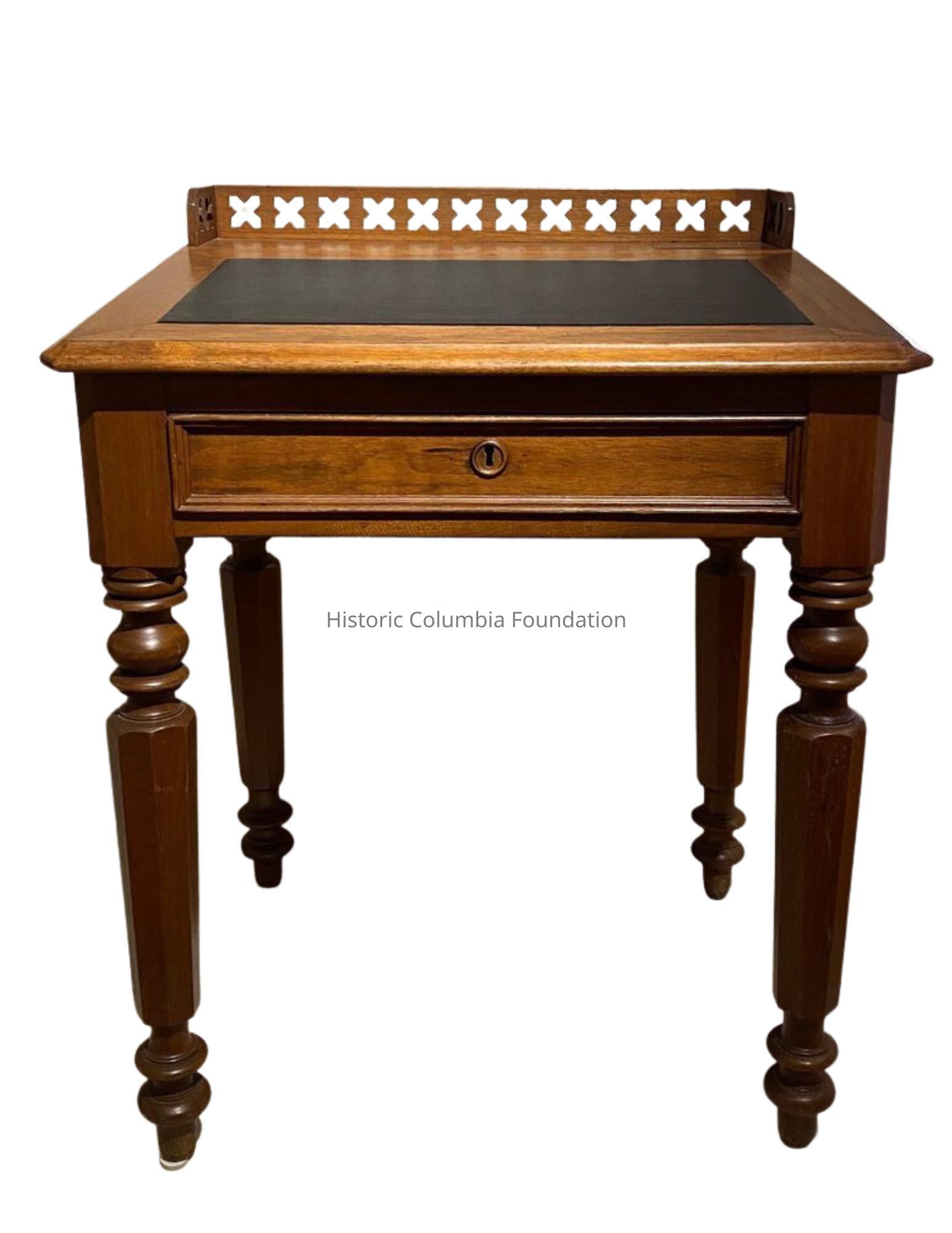 Walnut desk with turned legs, leather insert on the slanted top, and a single drawer. There is a pierced gallery along the top, extending slightly down each side. A brass plaque mounted on the back in the top right corner reads, "This Desk Was Used By Members Of The SOUTH CAROLINA LEGISLATURE During Reconstruction And For Many Years Afterwards." Each of the four tapered leg has eight sides and metal tips.