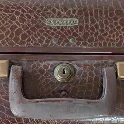 Dark brown suitcase with faux alligator skin finish. The suitcase has metal clasps, a locking mechanism, and a metal plate from the manufacturer reading "SHWADER BROS. INC. / Samsonite / DENVER, COLORADO." Residue from a sticker on the handle reveals the name of the suitcase's previous owner, Lisa Sherrer. The bottom of the suitcase includes a gold and maroon sticker with "STYLE NO. 4121," and the inside includes a cream-colored fabric lining.Made/Created