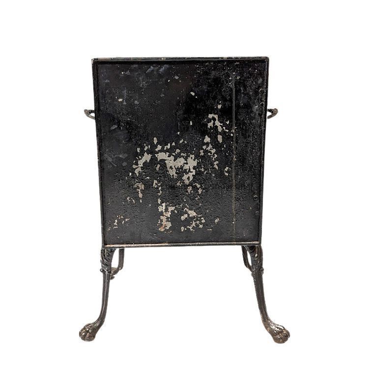 Tin and iron fireplace plate warmer. The object has a black varnish exterior and a tin interior featuring two shelves. The warmer rests on four iron cabriole legs with paw feet. The iron handles are rococo style. The door is hinged and opens to the object’s left side.Use