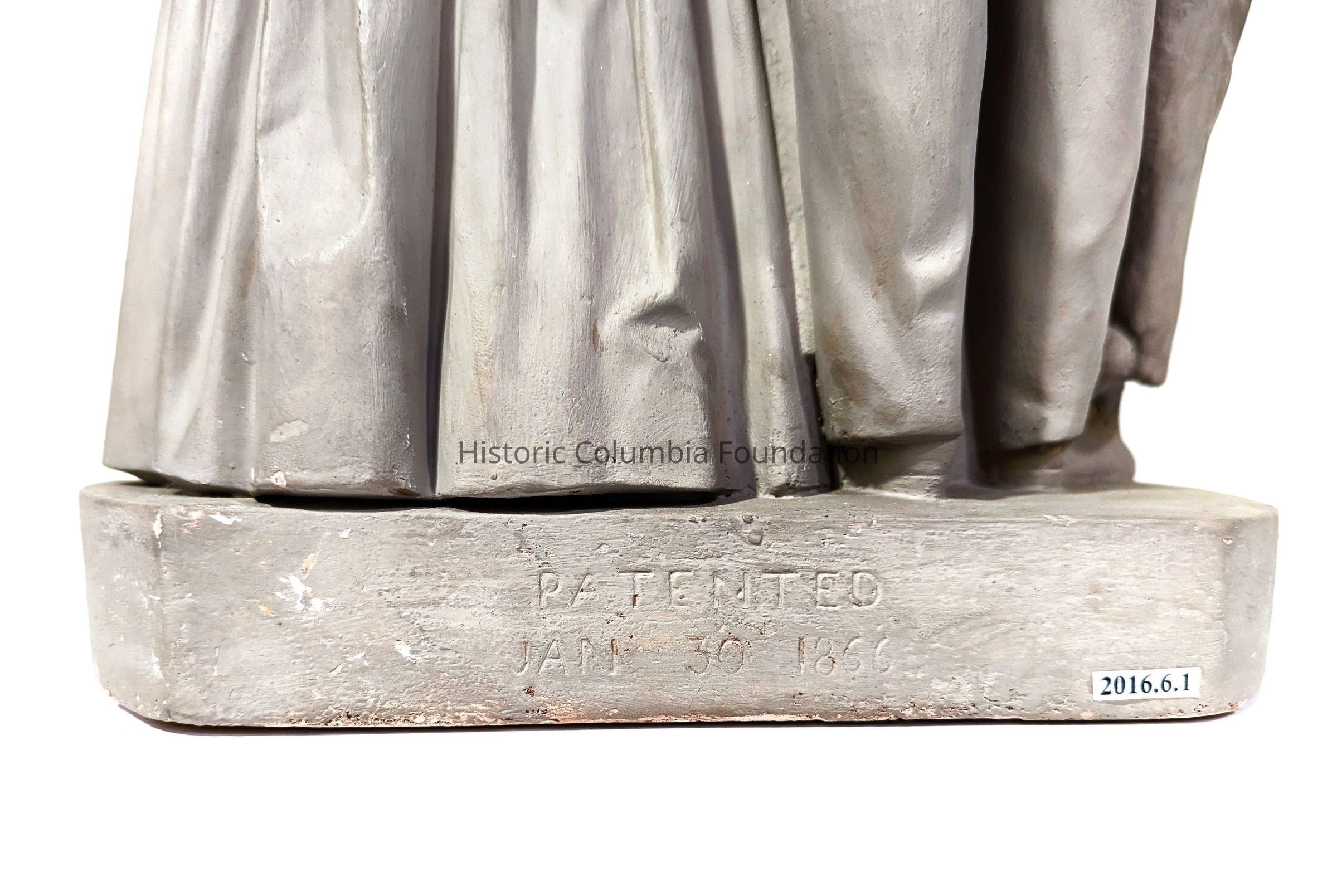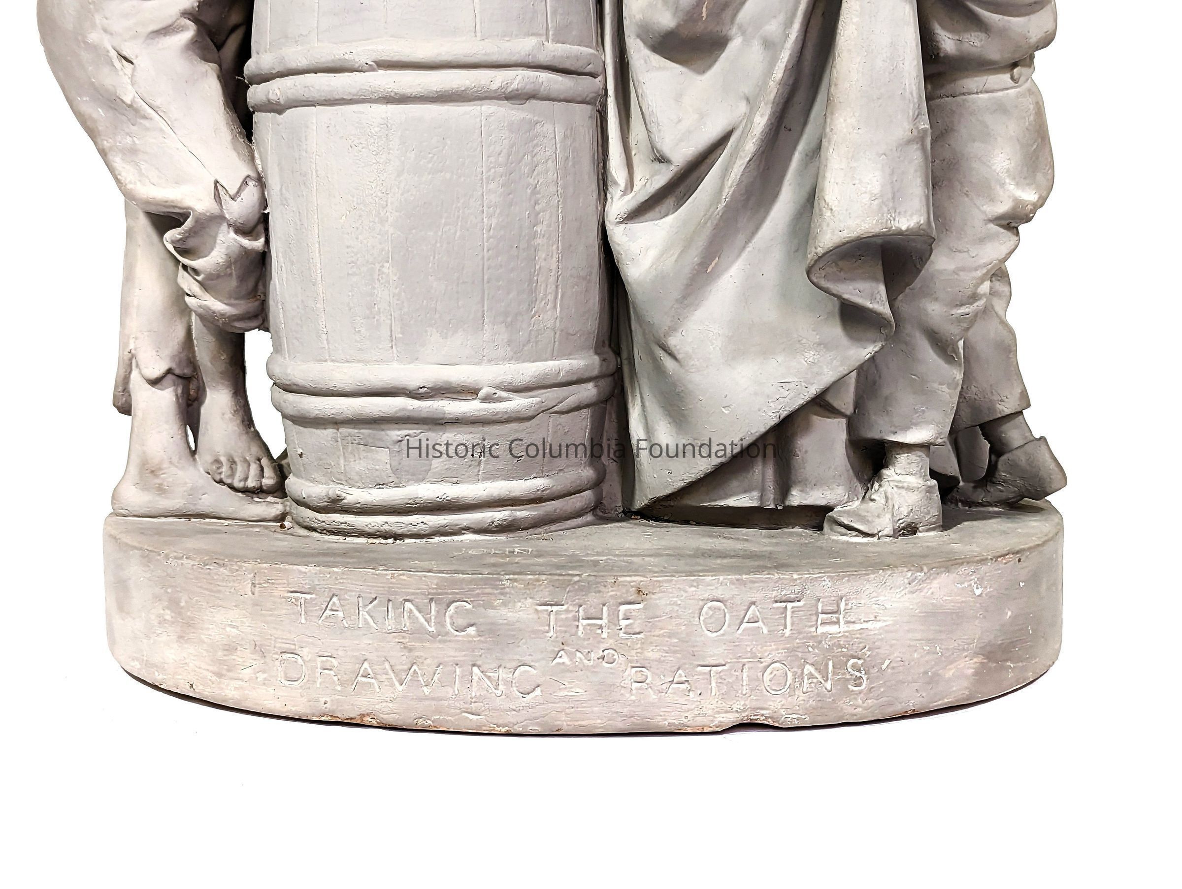 Gray plaster statue of a man, woman, and two children. The man appears in uniform, tipping his hat and holding a book on which rests the woman's hand. She is wearing a long dress, looking down toward her hand that is resting on the head of a small boy clutching her gown. On the other side of the soldier is a presumably enslaved boy in tattered clothing and no shoes. He is leaning on a basket on a barrel, watching the interaction between the man, woman, and other child. The title of the piece is inscribed on the base, "Taking the Oath and Drawing the Rations."Type of Sculpture
