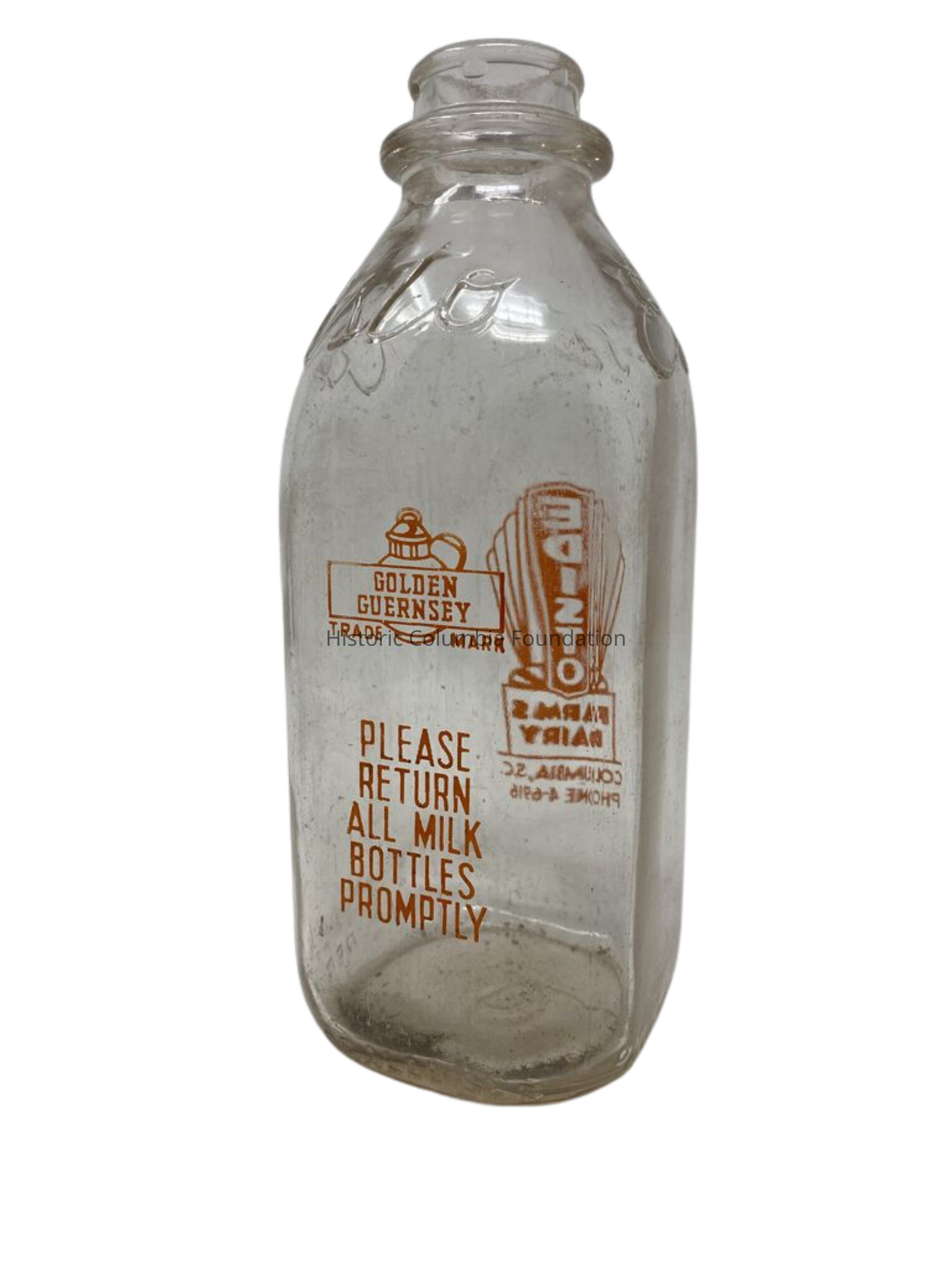 Based on the phone number listed on its front, this milk bottle was made between 1952 and 1954. Available for purchase at any of the Edisto Farms Dairy stores or ordered for home delivery, the Golden Guernsey milk that came in this bottle would have had a golden-yellow tinge due to its high beta-carotene content, and it was known for its rich flavor and high levels of fat and protein. As is made clear by the label on the back of the bottle, milk bottles were returned and reused. A glass ledge on the neck of the bottle probably served the dual-purpose of making it easier to grip and providing the base for a waterproof paper closure.Made/Created