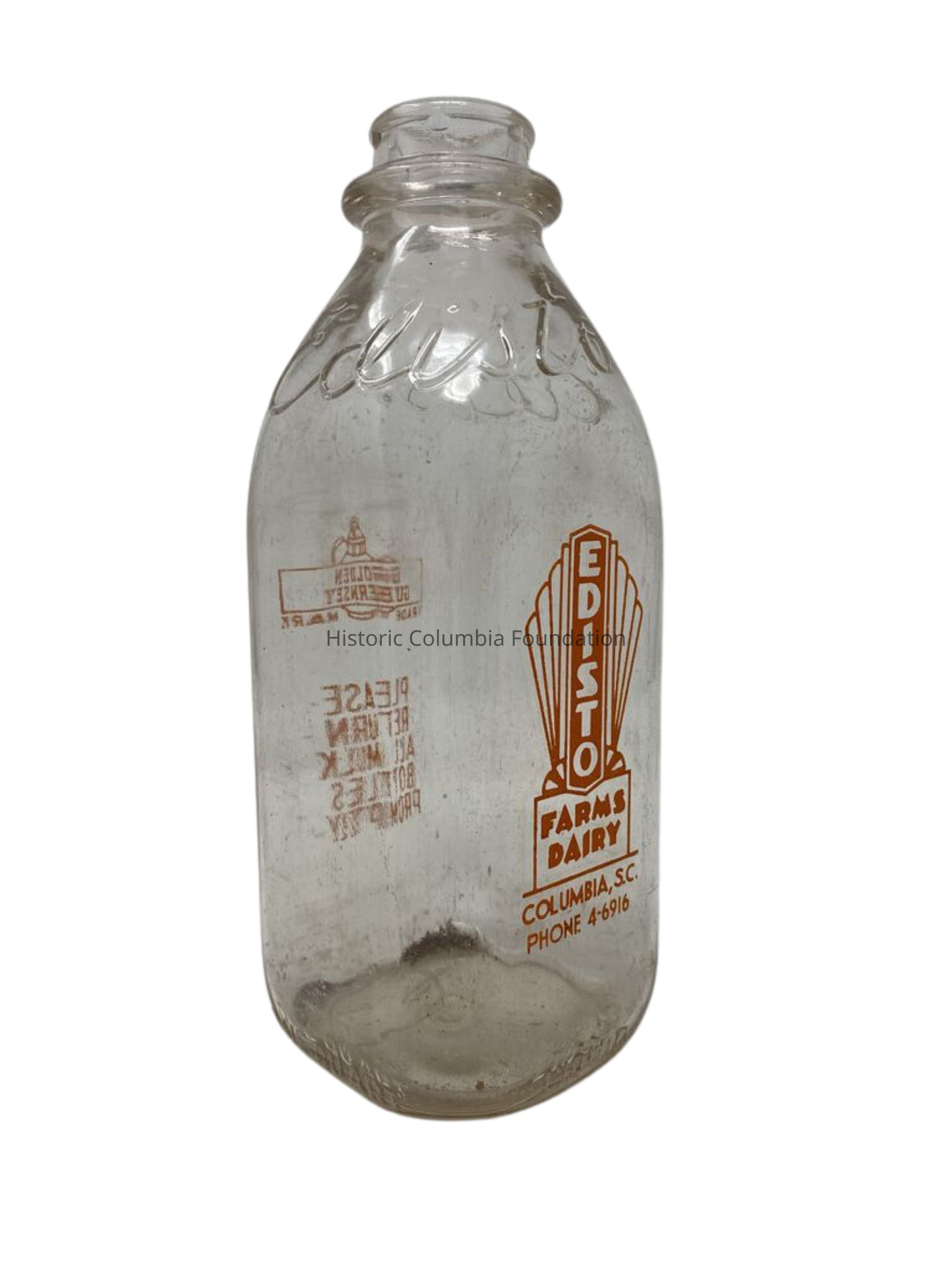 Glass milk bottle from embossed "Edisto" twice around neck of the bottle. It is labeled on the front in red lettering “Edisto Farms Dairy Columbia, S.C. Phone 4-6916." The back is labeled also in red lettering: "Golden Guernsey Trade Mark" with a depiction of a milk pitcher and "Please Return All Milk Bottles Promptly." There are additional labels embossed on the bottle, including "Liquid,” "One Quart," "Sealed | 52 S.," and "Reg." The neck of bottle features a glass ledge.Context