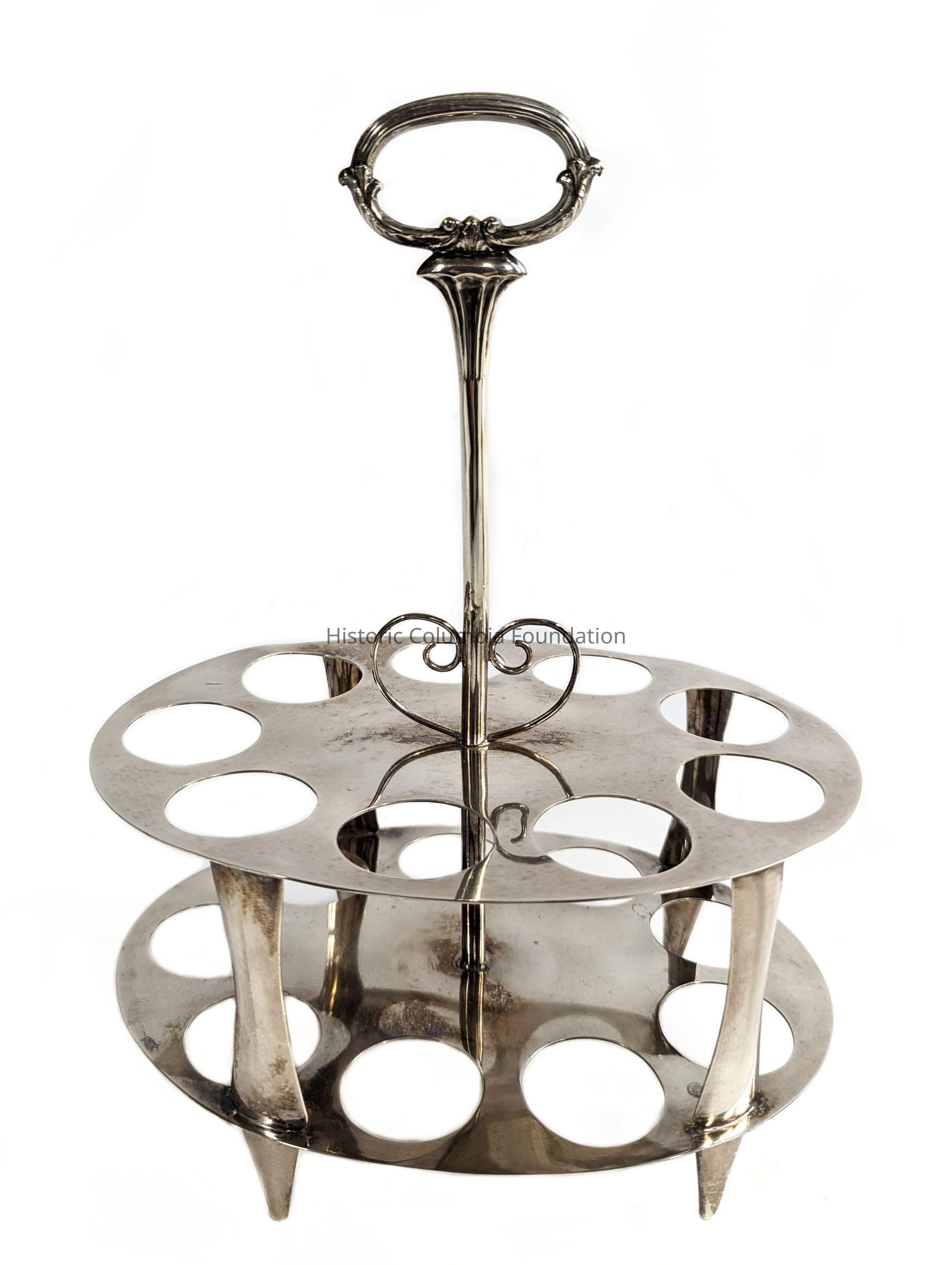 Egg cookers like this were first seen in English upper-class homes in the late 1700s. This piece is equipped to hold 18 eggs at once, significantly more than the standard six. In the mid-1800s, it would have been placed in a dining space to warm eggs with boiled water, allowing the eggs to be served hot. As there is no burner under this piece, the device was likely used to keep the eggs warm after they were initially boiled in another pot over a fire. The eggs would have been collected, boiled, and placed within the device by enslaved people, who were also required to collect and heat the water used for the boiling and warming.Context