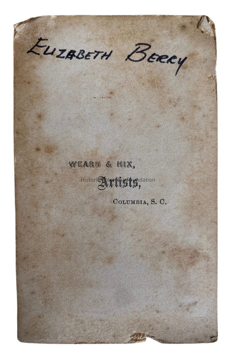 Elizabeth Ayers Berry (1852–1930) was the daughter of cabinetmaker Milo Berry (1819–1907) and his second wife, Julia Meiggs Berry (1822–1906). Milo Berry came to Columbia, South Carolina from Newark, New Jersey in 1845 where he established a successful furniture making business. In his will, he left one of his residences—1413 Senate Street—to his two unmarried daughters: Elizabeth and Caroline Berry (1859–1936). Both sisters lived the entirety of their lives in the city, dying in their home on Senate Street six years apart. They are buried at Trinity Episcopal Cathedral Cemetery near their parents.