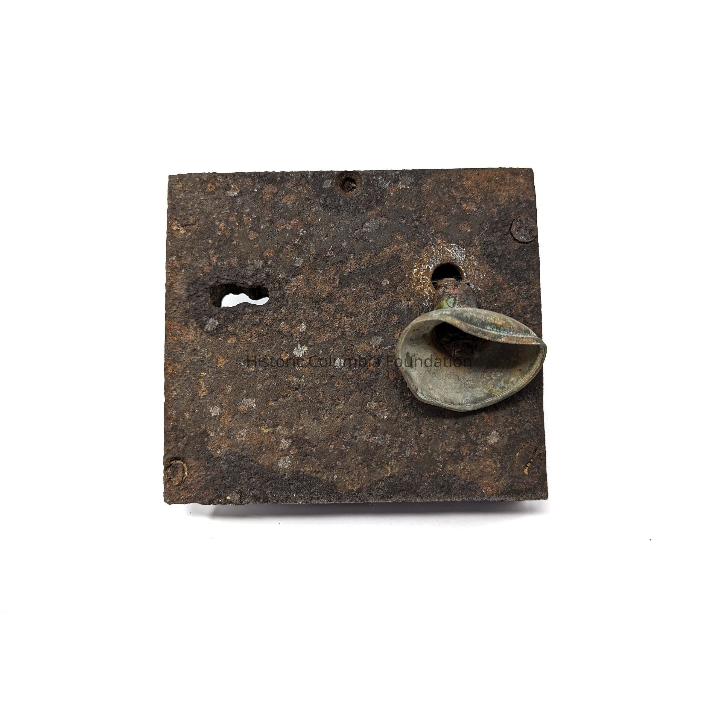 Iron gate lock with a key hole and door knob at front and back of lock box. The doorknob is ornately decorated.Context