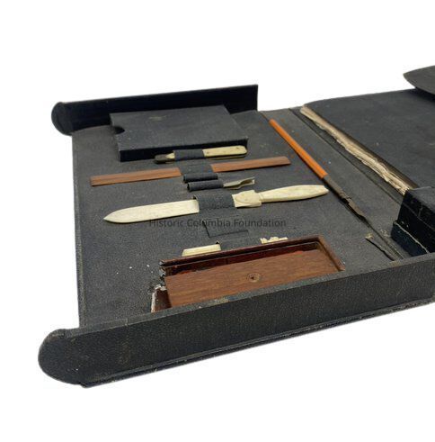 This handheld writing case was designed to be portable. As letter writing was the primary form of communication throughout the nineteenth century, even simple cases like these were utilized by white men as they sought to manage their affairs while traveling.Context