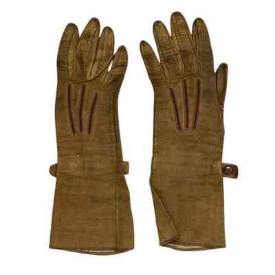 Pair of light brown leather gloves. The back of each glove features three braided points, and the front includes a strap around the wrist. The gloves have darkened around the touch points, especially the tips of the fingers and the sides of palms.Use