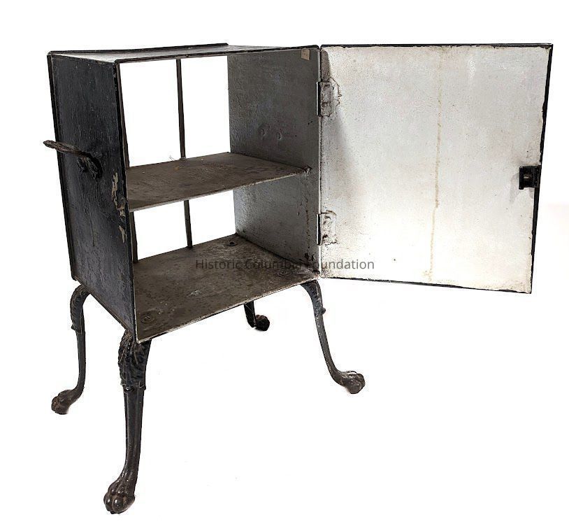 Tin and iron fireplace plate warmer. The object has a black varnish exterior and a tin interior featuring two shelves. The warmer rests on four iron cabriole legs with paw feet. The iron handles are rococo style. The door is hinged and opens to the object’s left side.Use