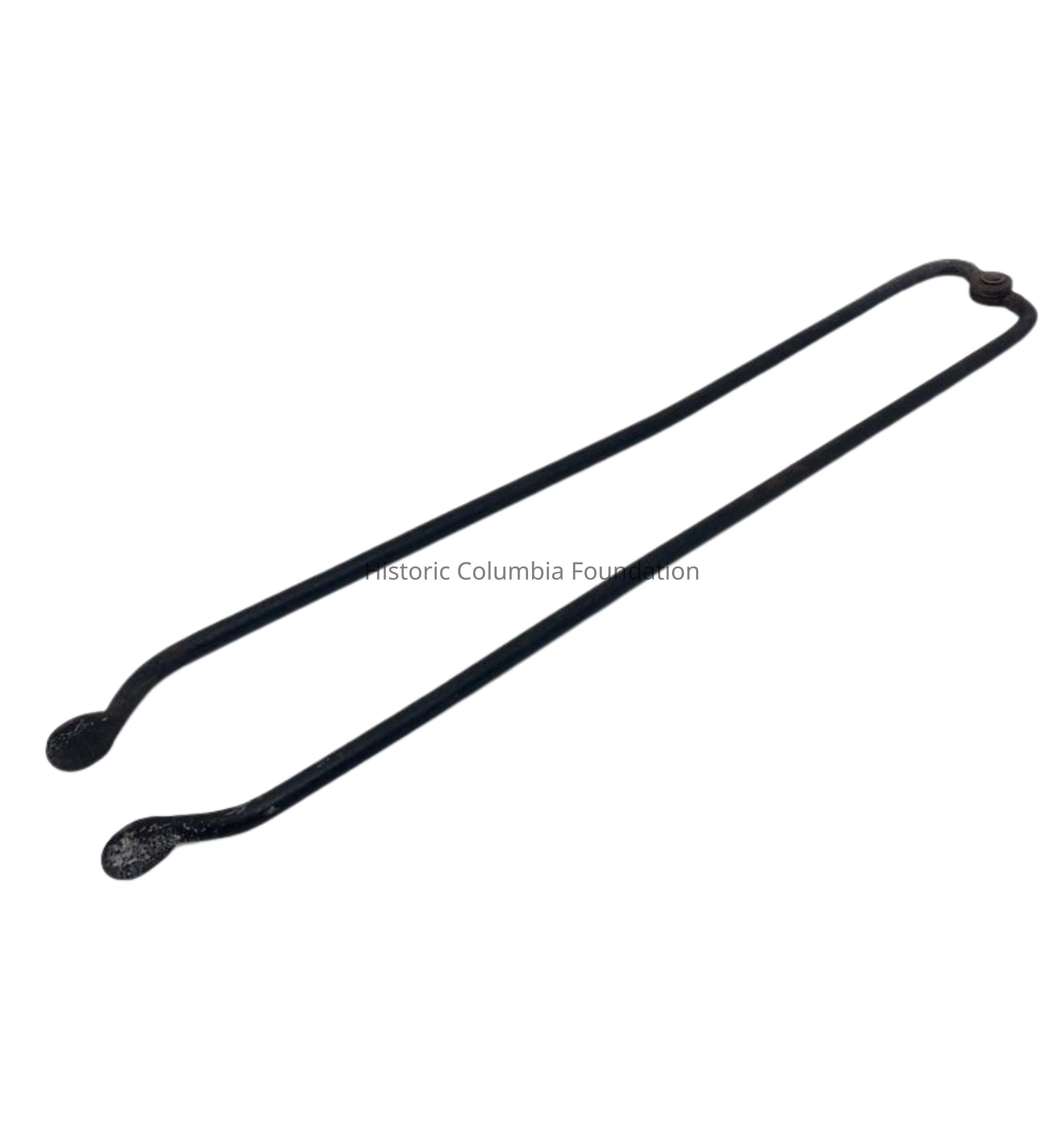 Fireplace tongs are used to adjust logs within a fireplace. This particular set lacks wooden handles, which means the person stoking the fire would have used potholders to protect their hands from the heated metal.Context
