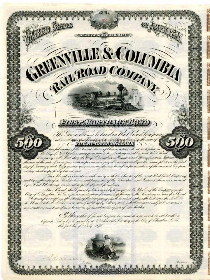 Paper bond for the Greenville & Columbia Railroad Company for the denomination of $500. The bond is printed in green and brown ink on yellowed paper, and the number 32 is stamped in red ink in several places. The left side of the bond has vignettes of a steam locomotive and a woman with a cornucopia, as well as markings of $500; the right side of the bond consists of 40 small coupons for $17.50, equal to seven percent interest on $500 for six months, with the explanation that each one is redeemable on January 1 or July 1 of the years 1876 until 1895.Context