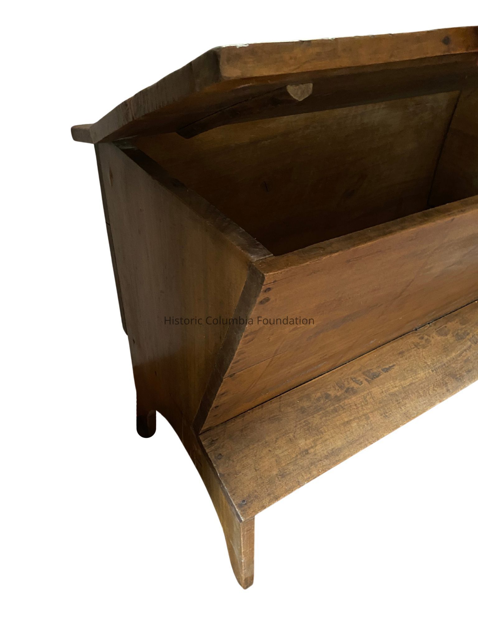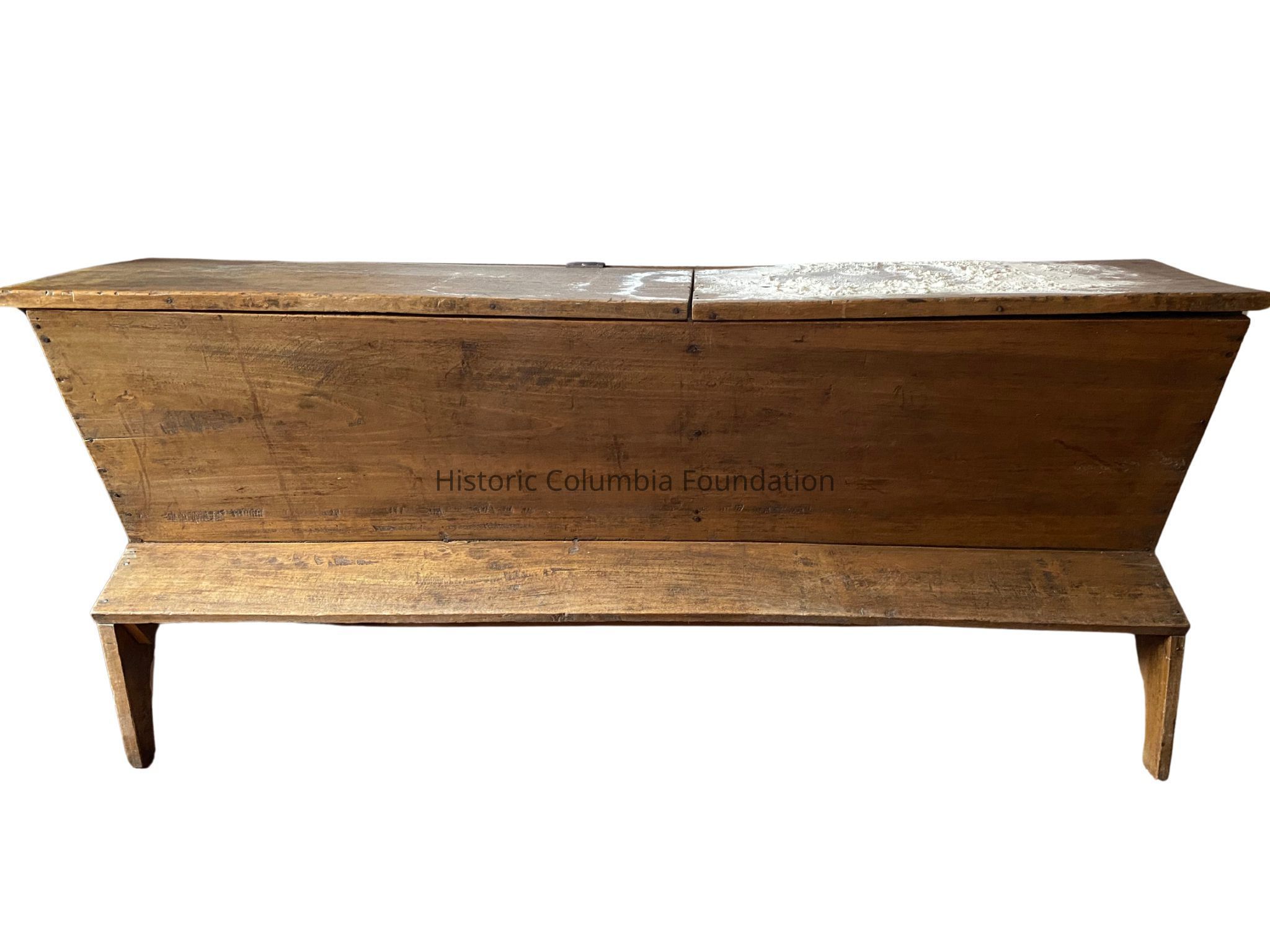 Bread was a common staple served at a 19th century table. In order to make large quantities of dough, bakers mixed flour, water, and yeast in a dough box such as this. After kneading, the dough was left covered in the box to rise. It was then divided into individual loaves, rolls, or biscuits, allowed to rise again, and later baked in a brick oven or over a fire. The lid of the box also served as a work surface for shaping loaves or cutting biscuits.