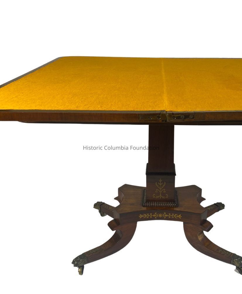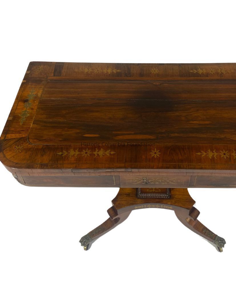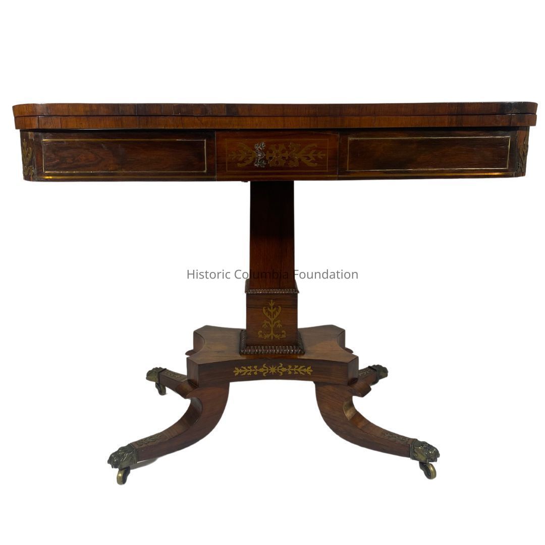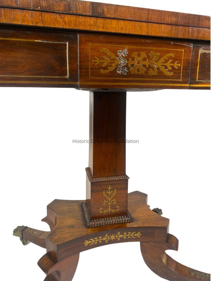 Regency style card or game table with a fold top. Made of rosewood veneer as the primary wood and yellow pine as the secondary wood, the rosewood top has a wide crossbanding inset with stylized brass medallions. When rotated and folded into a table, the table is topped with a yellow felt. The top rests on a tapered square pedestal with similar brass stylized foliage sprays inlaid, supported by a quatrefoil platform base with a foliage band. The table has simplified reversed "C" scroll legs, tipped with brass lion paw feet on brass casters. The card table is signed “Mr. Gravenor Portsed” on top of the pedestal.Context