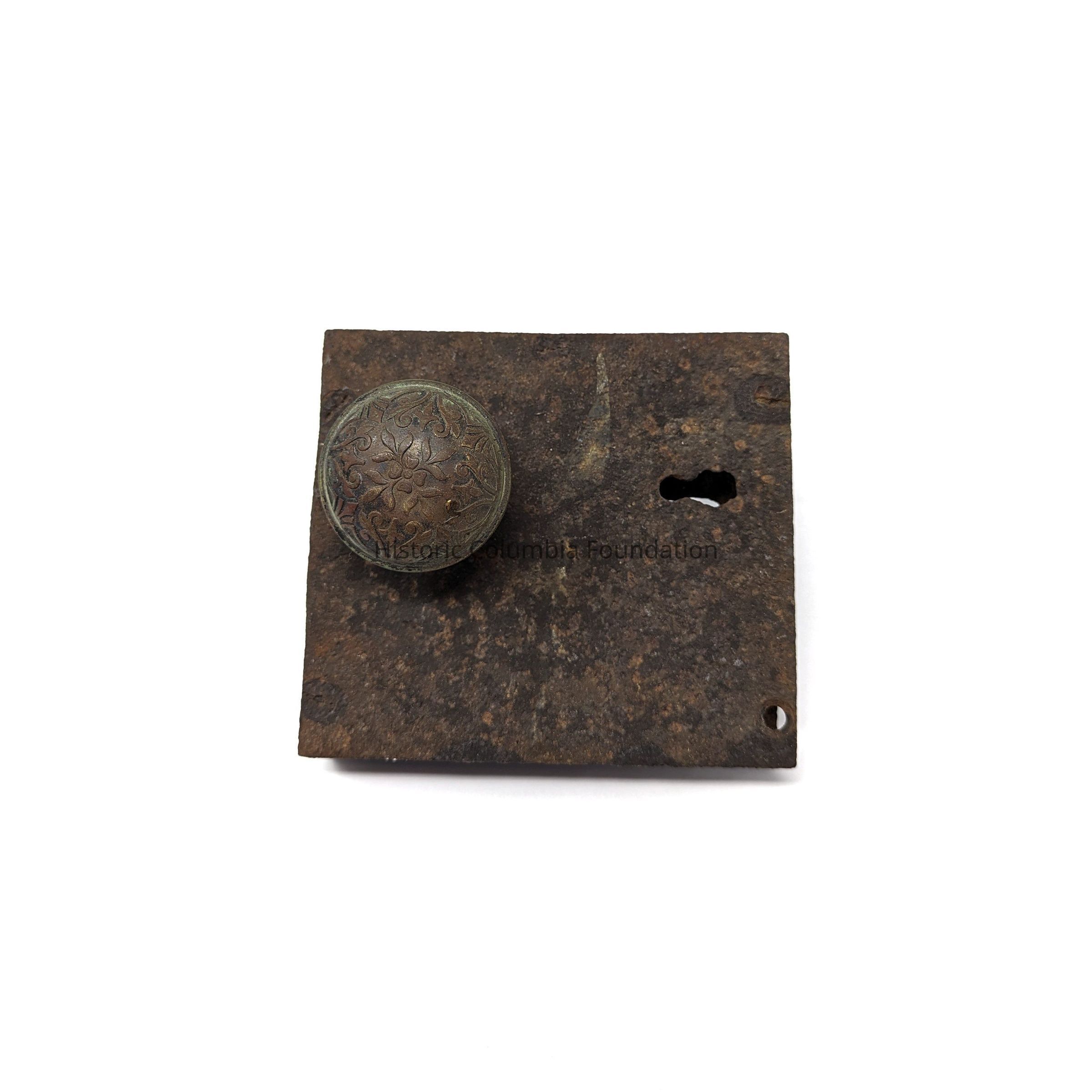 Iron gate lock with a key hole and door knob at front and back of lock box. The doorknob is ornately decorated.Context
