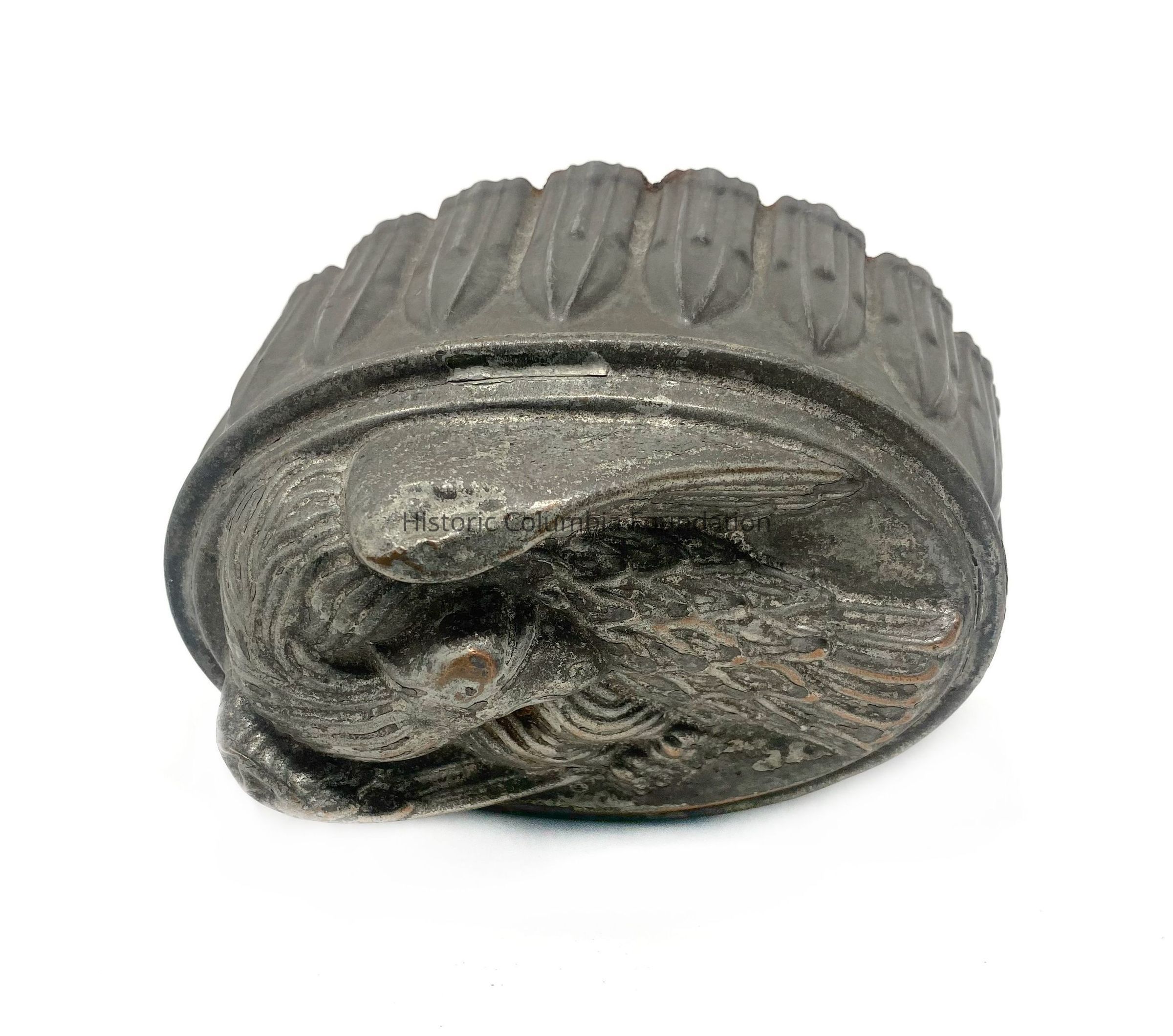 Copper gelatin mold featuring a bird. It has ribbed arch fluting on the sides.Context