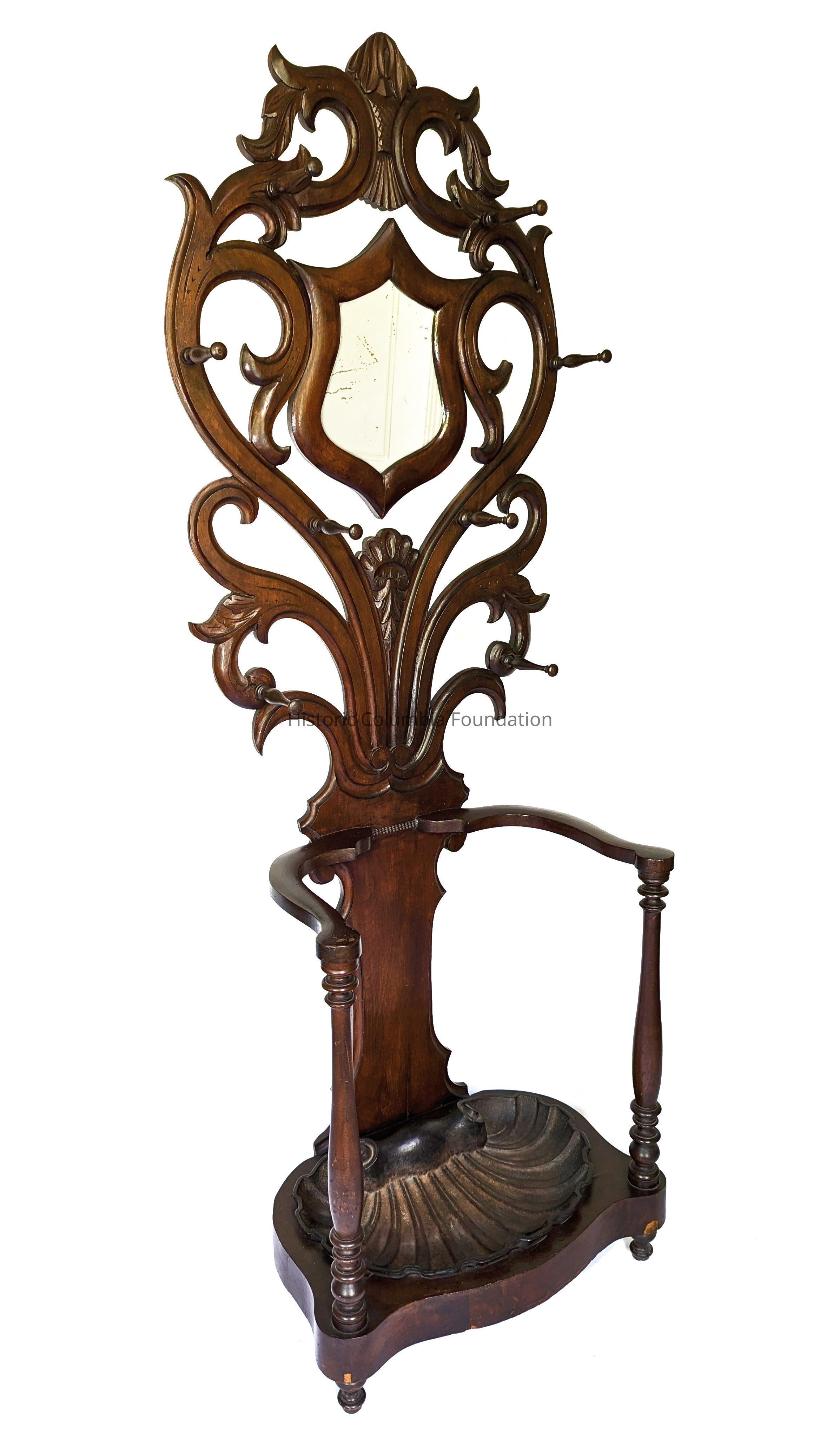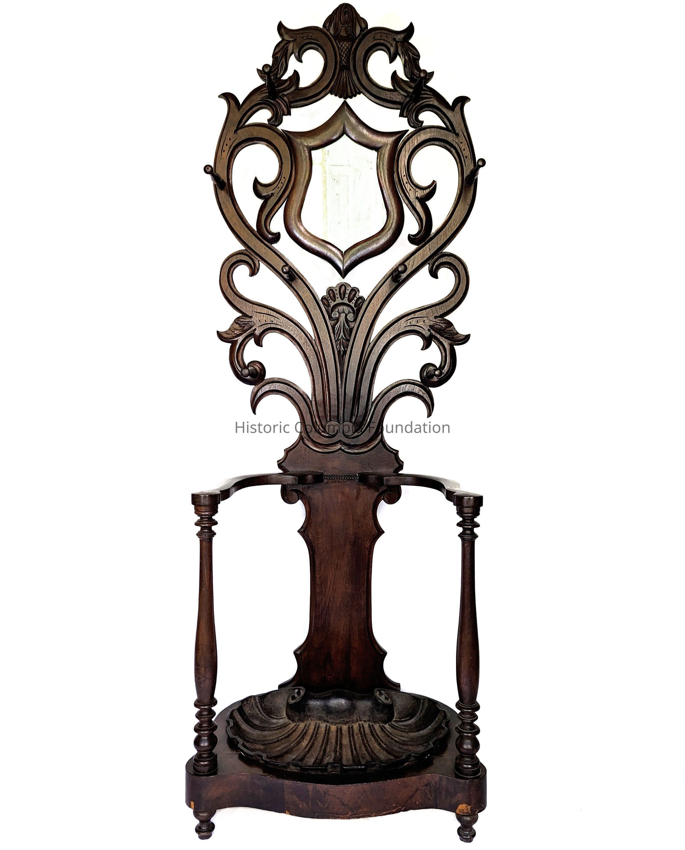 Walnut hall tree. It has a large, open back with large, open foliage scrollwork. There are eight hanging pegs and a mirror in shield-shaped frame. The bottom includes a D-shaped frame as the umbrella stand base with an iron scallop-shell design drip pan.Use