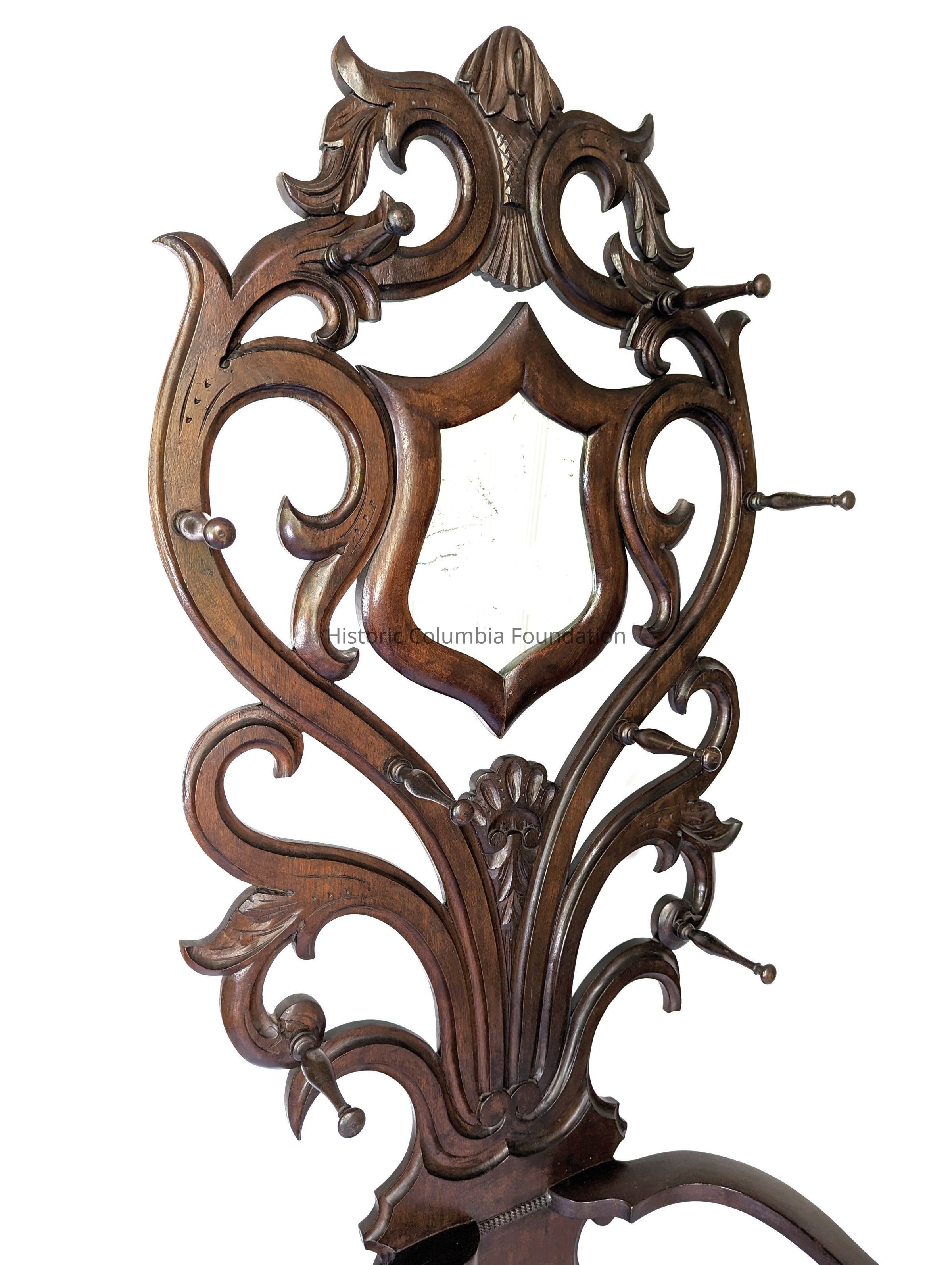 This hall tree is believed to have been owned by the Woodrow family and might predate their move to Columbia. As 1705 Hampton Street was the first home built for and owned by Woodrow Wilson's father, Joseph Ruggles Wilson (1822–1903), it is possible that Joseph and his wife, Jessie Woodrow (1826–1888), purchased this and other furniture pieces from local cabinetmakers.Dimensions