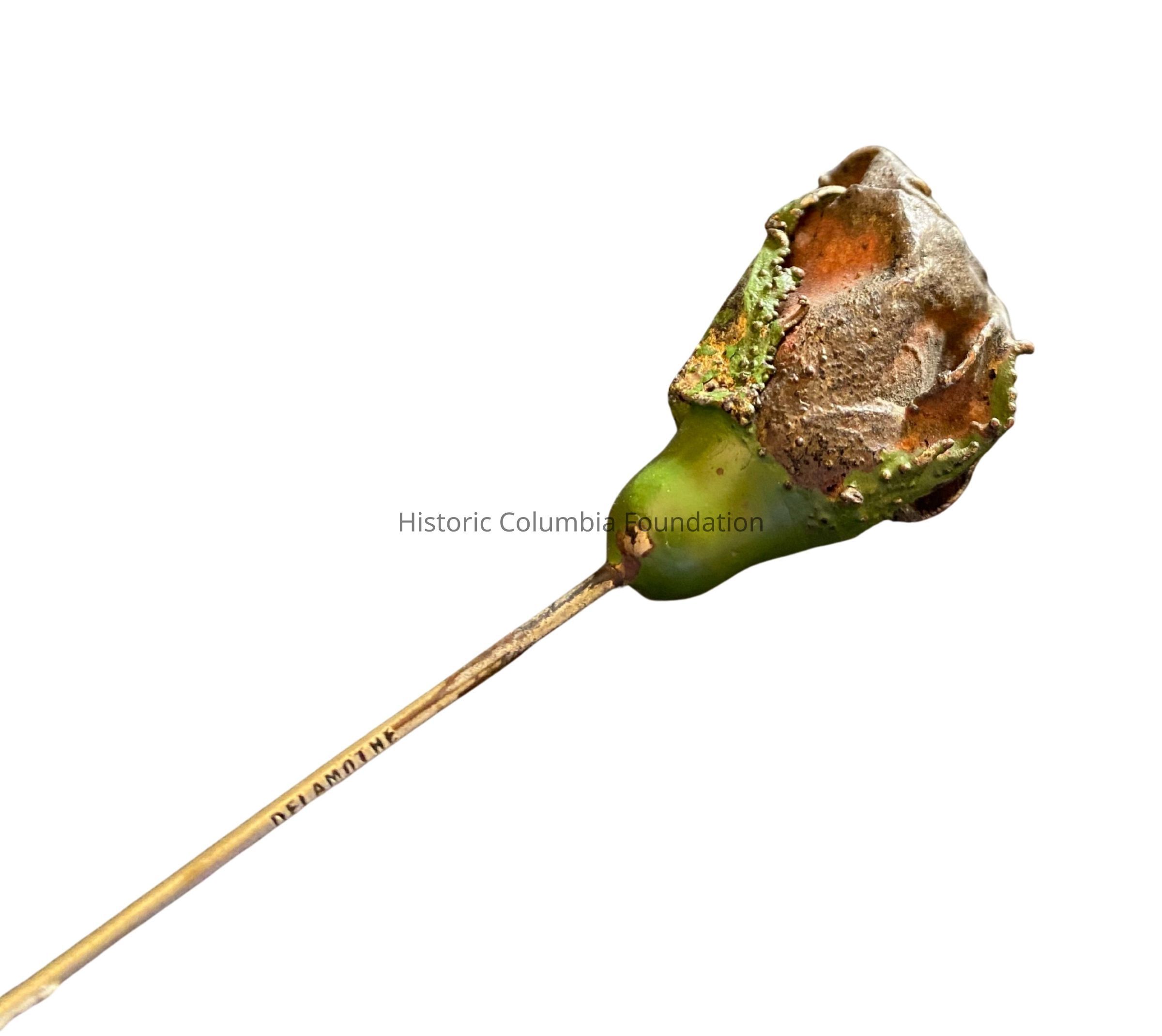 This hatpin was produced by Delamothe Natural Art Decorating Company Inc. using a live rose. Founded in 1908 by professor and prominent French-American electrometallurgical scientist Louis G. Delamothe (1861–1928), the Delamothe company took off in the heart of the so-called "rose district" in Spokane, Washington. During his business's brief time in operation, Delamothe advertised that he had capacity to make up to 1,500 "real rose hat pins" a day and that his selection of metallized rose hat pins came in six sizes and five different colors. While stores continued to stock Delamothe's wares for several years, he closed the business by 1910.Dimensions