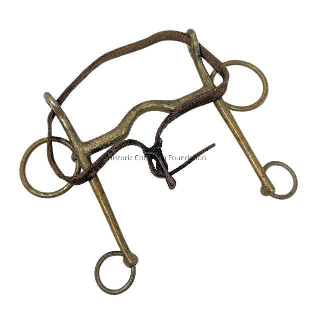 Brass horse bit with leather strap and iron buckle. There are four rings still attached to the bit for additional straps and the harness.
