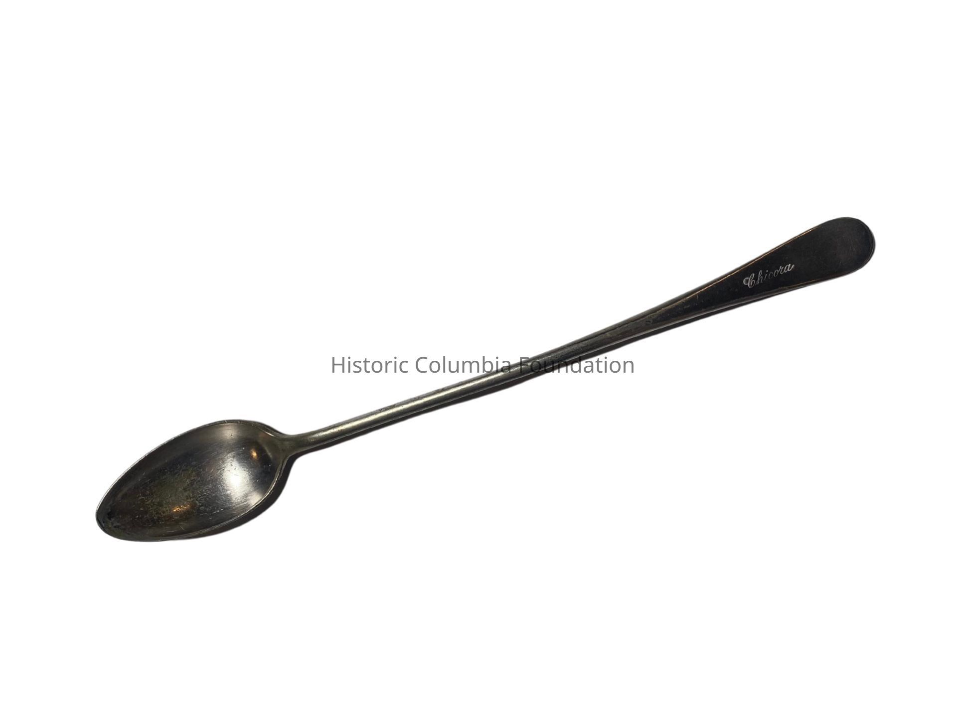Two plain long, thin iced tea spoons engraved "Chicora" on the front of each handle. Both spoons have different maker's marks on the back of their handles.Context