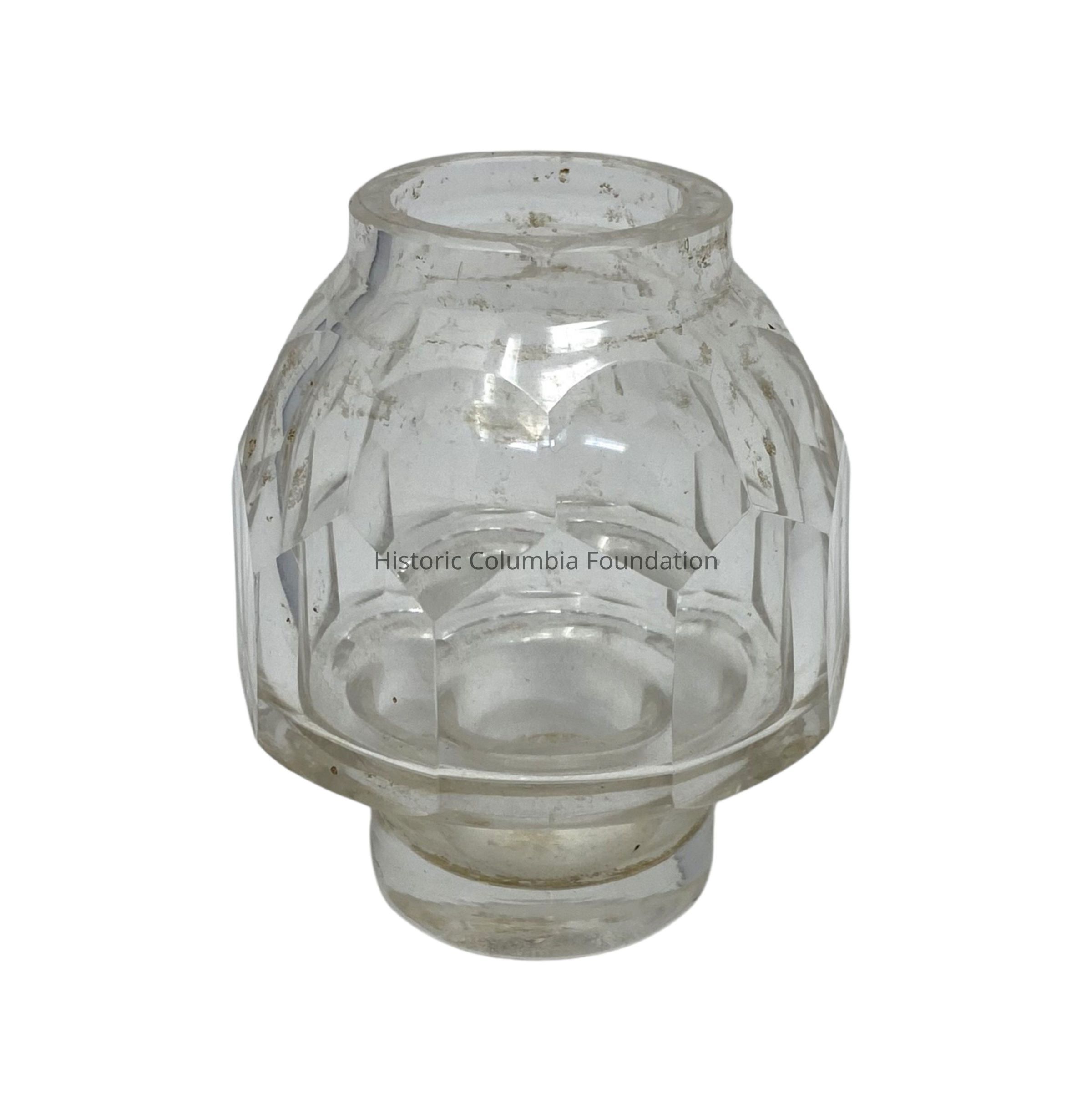 Glass inkwell in the shape of a mushroom with a circular base. Along the sides, five-sided shapes create angles that interrupt the otherwise bulbous design.Made/Created