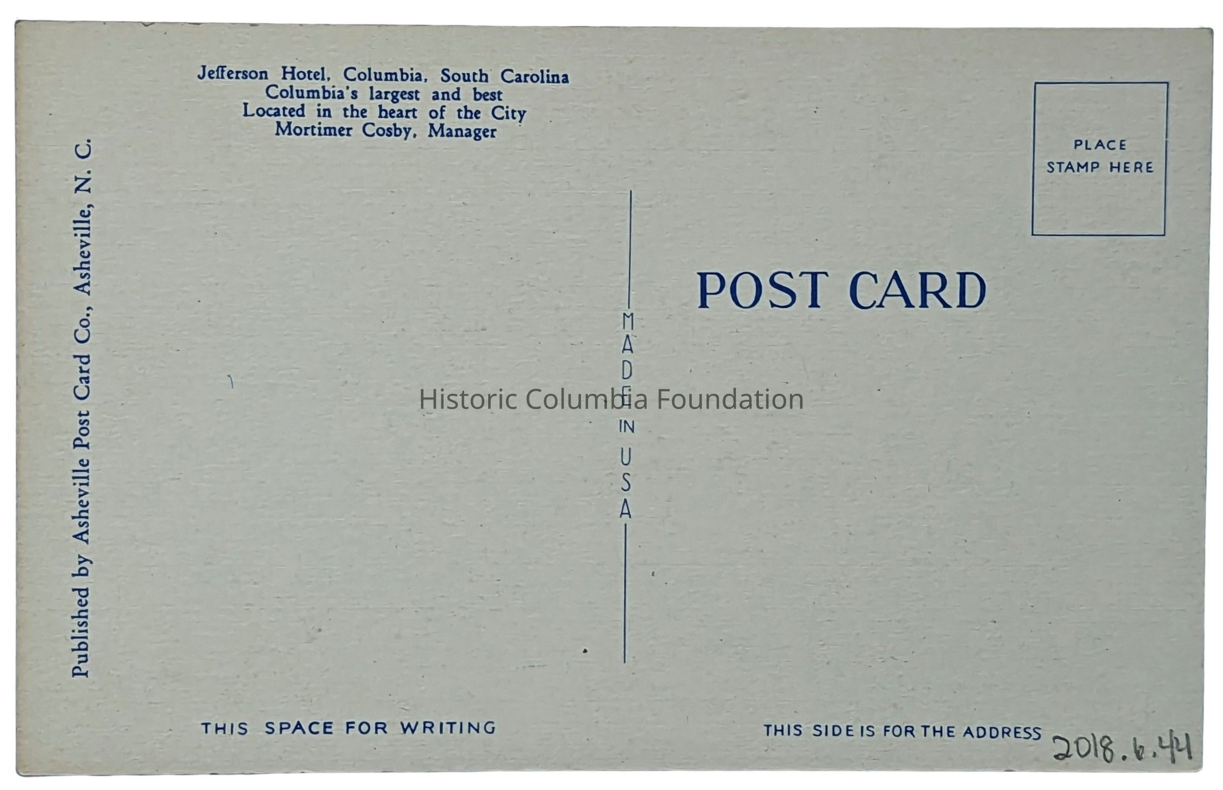 The back of the postcard includes a brief description of the building: "Jefferson Hotel, Columbia, South Carolina / Columbia's largest and best / Located in the heart of the City / Mortimer Cosby, Manager." The lefthand side includes a note acknowledging the publisher: "Published by Asheville Post Card Co., Asheville, N.C." The postcard contains no written message and was never mailed.Subject