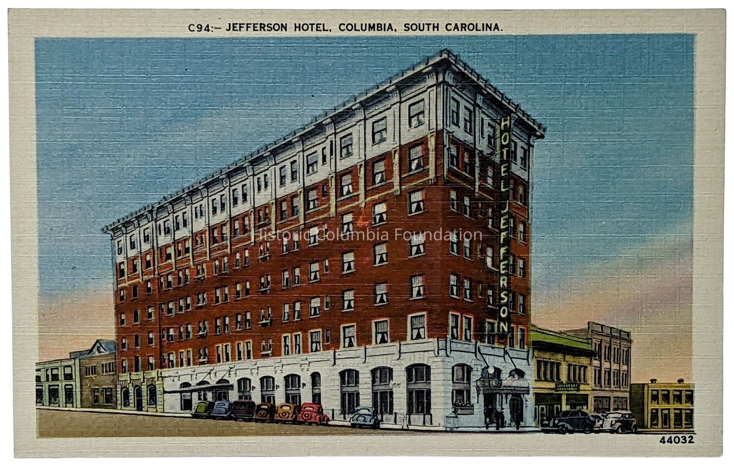 Postcard depicting the Jefferson Hotel. On the front, the postcard features a large red brick and white stone hotel building on the corner of a downtown city block. There are smaller buildings on either side of the hotel, along with 1930s cars parked along the sides of the roads. The top of the postcard reads: "C94:–JEFFERSON HOTEL, COLUMBIA, SOUTH CAROLINA." The bottom rightnad corner includes the number "44032."