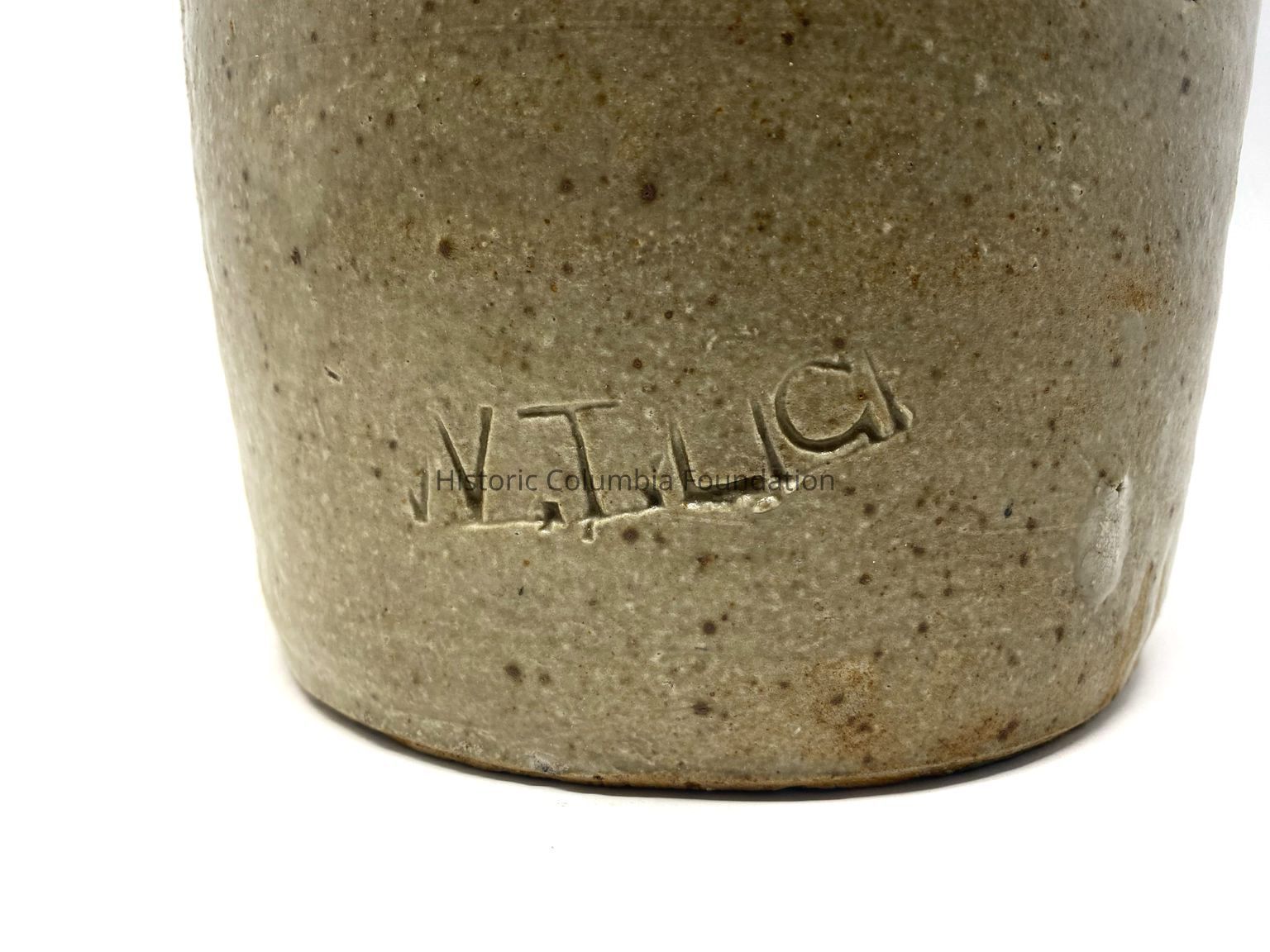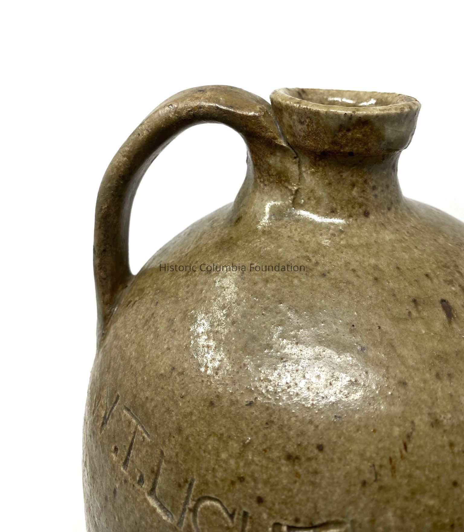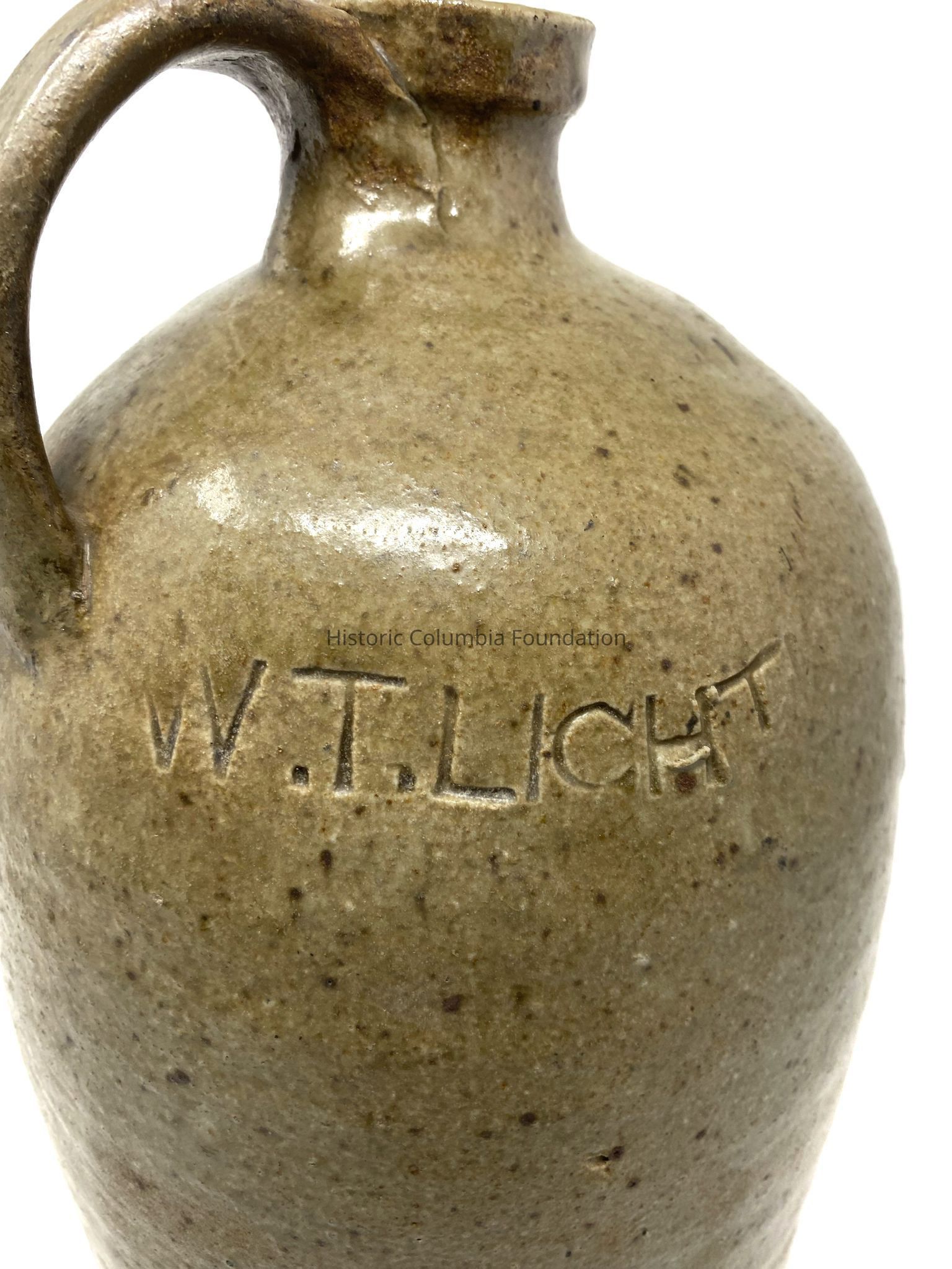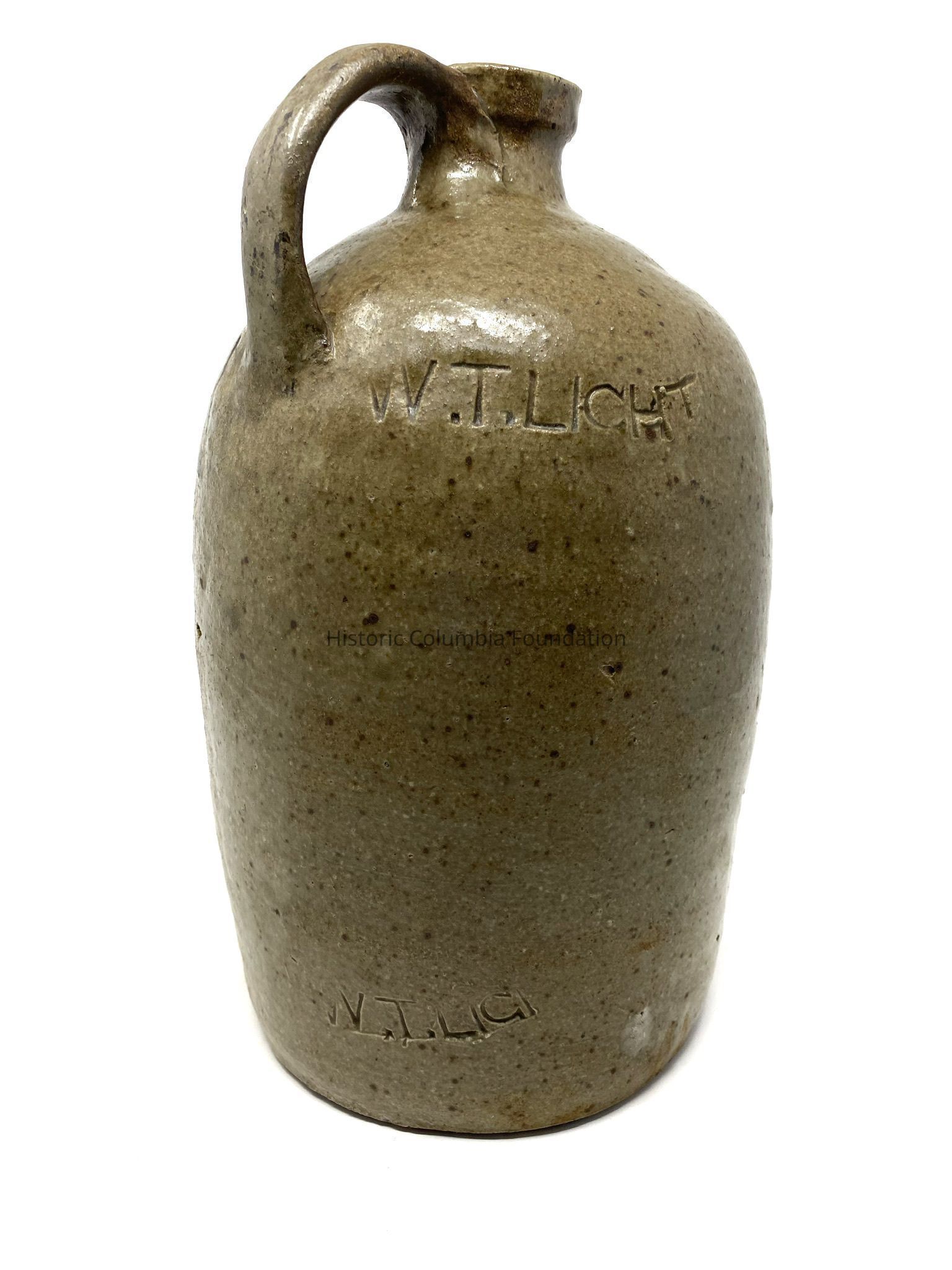 This jug is attributed to John James Stork's (1841–1915) Pottery of Richland County. It is stamped twice for W. T. Light, who may have been a Columbia area merchant, although further research is needed.