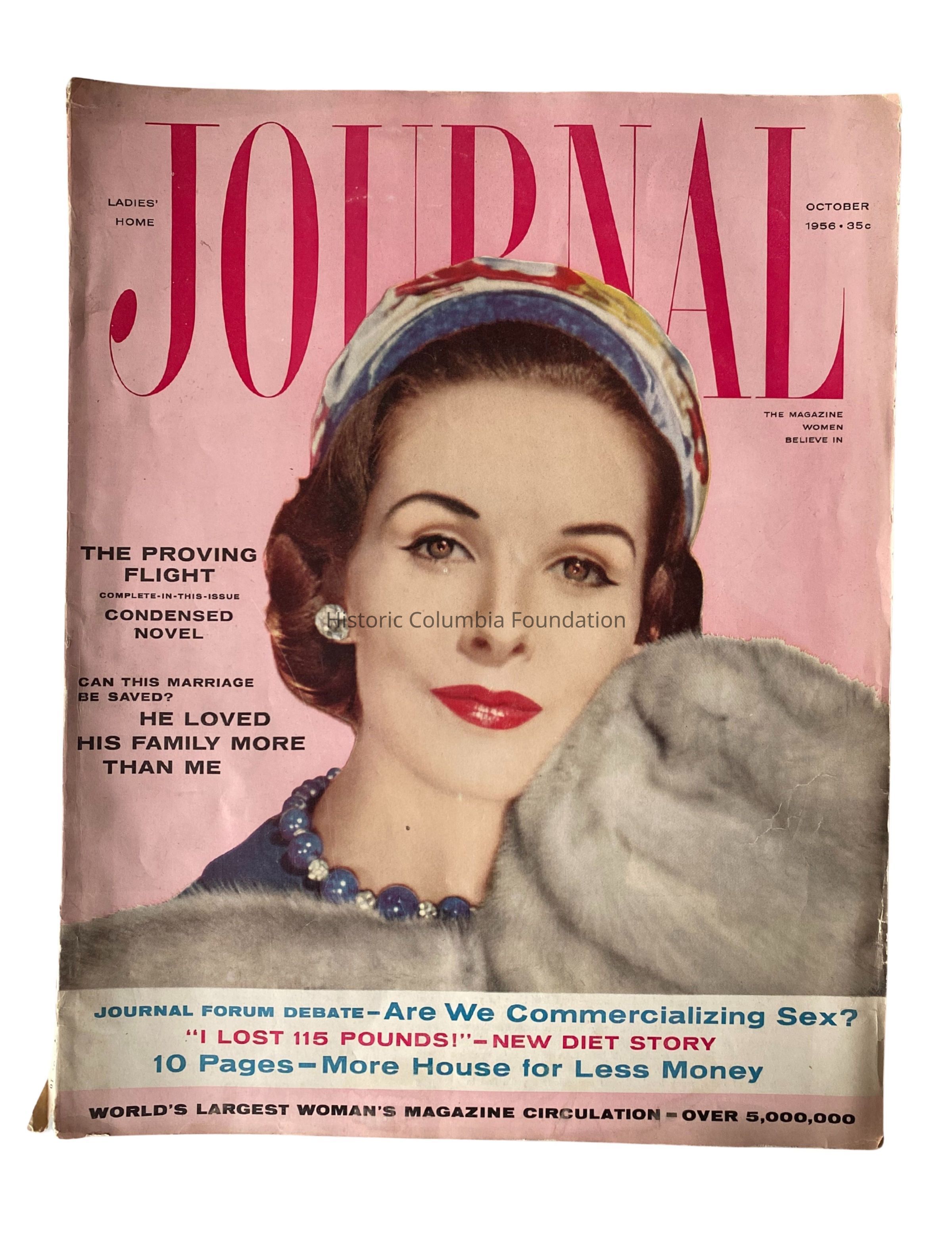 "Ladies' Home Journal." The cover of the magazine features a white woman with brown eyes, chestnut brown hair with tight waves, a floral cap, and grey furs against a pink backdrop. Behind her the magazine title begins with "Ladies' Home" before concluding with the word "JOURNAL" in large red letters. In a smaller black font, the cover also reads "October 1956 · 35¢" and "The Magazine Women Believe In." The left side and lower portion of the cover includes excerpts and article titles. The interior contains many colorful mid-century advertisements.Publication Details