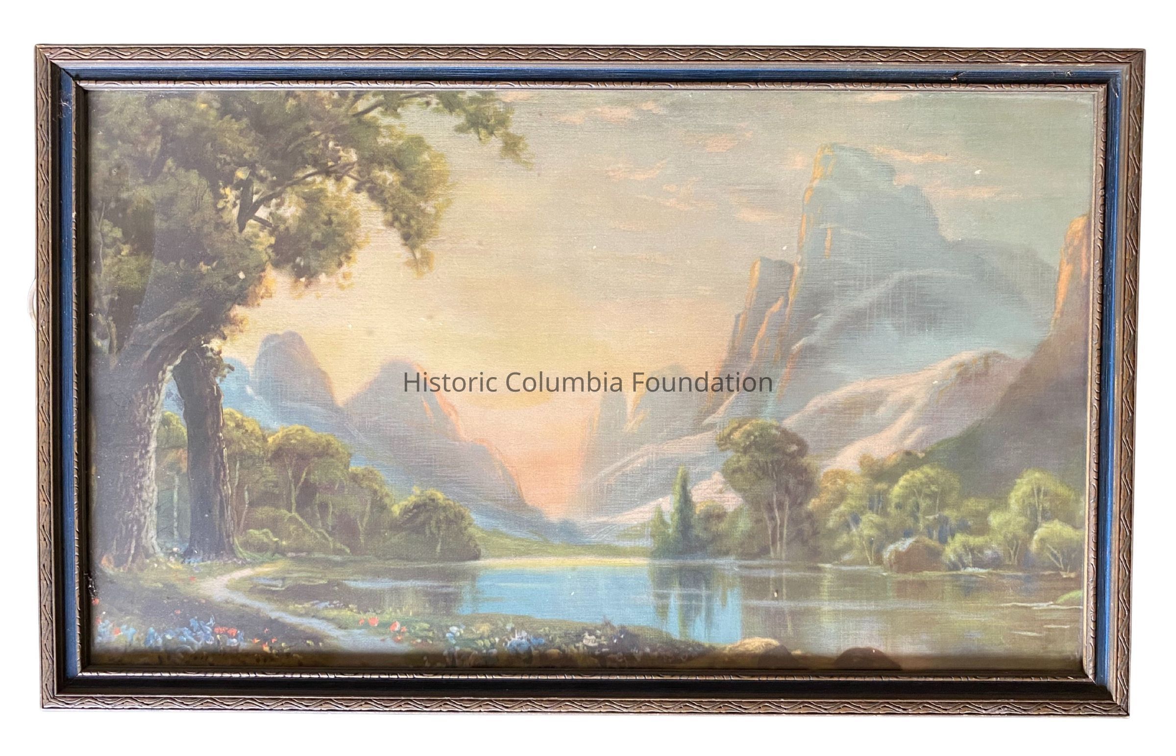 Framed mountain landscape. A tree frames the left foreground while a distant mountain encompasses the right side of the scene. Along the bottom, the woodlands are depicted in the reflection of a body of water. Near the horizon, the sky is a light shade of orange, as though the sun has just set or is about to rise. The print is displayed in a black and gold frame.Made/Created