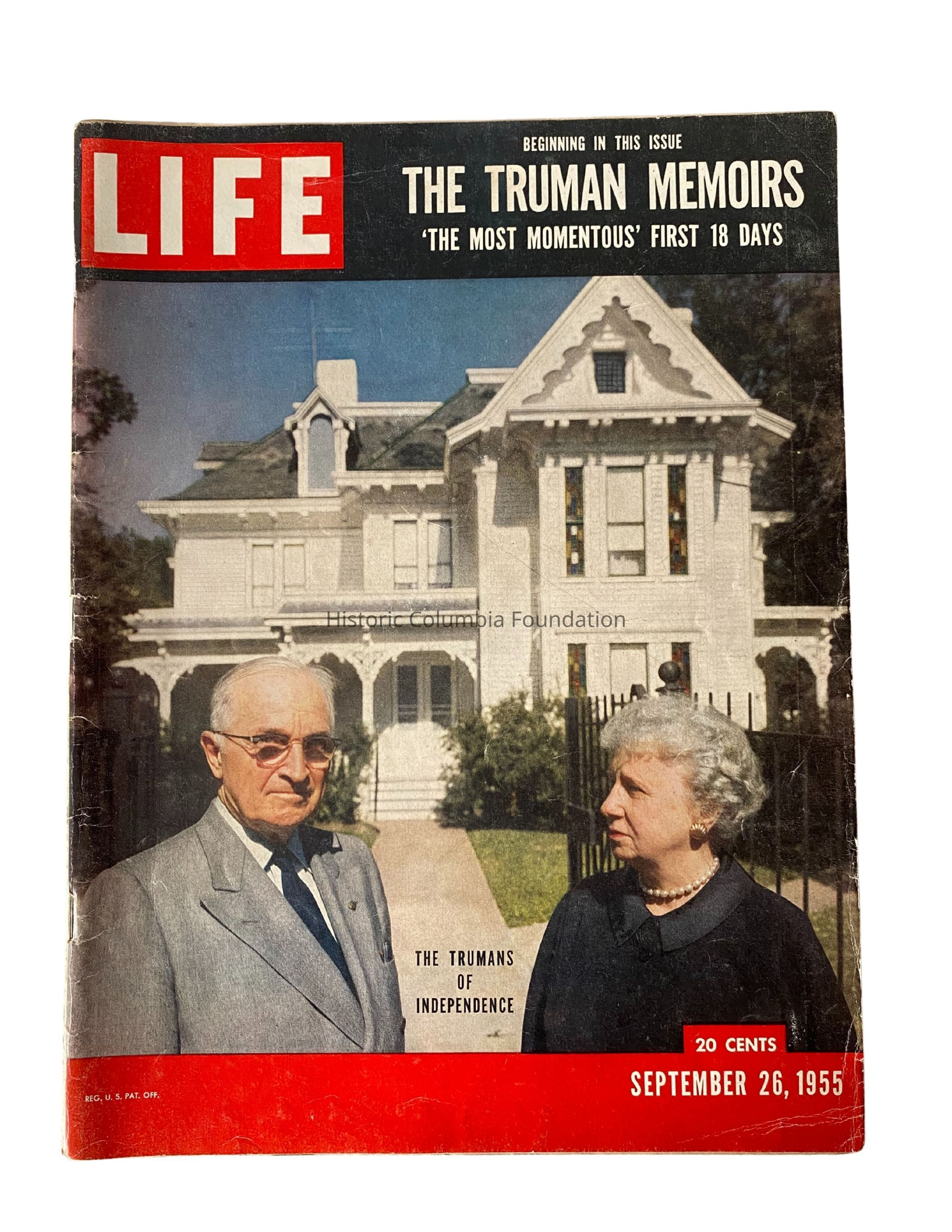 "LIFE Magazine." The cover features a white Victorian house behind President Harry S. Truman—a white man with thinning white hair, glasses, and a grey suit—and First Lady Elizabeth Truman—a white woman with short white curly hair wearing a black collared dress and a pearl necklace. Across the top of the cover, it reads "LIFE / Beginning in this issue / The Truman Memoirs / 'The Most Momentous' First 18 Days." Along the bottom is also notes "The Trumans of Independence" and "20 Cents / September 26, 1955." The back cover features an advertisement for Lucky Strike Cigarettes.Publication Details