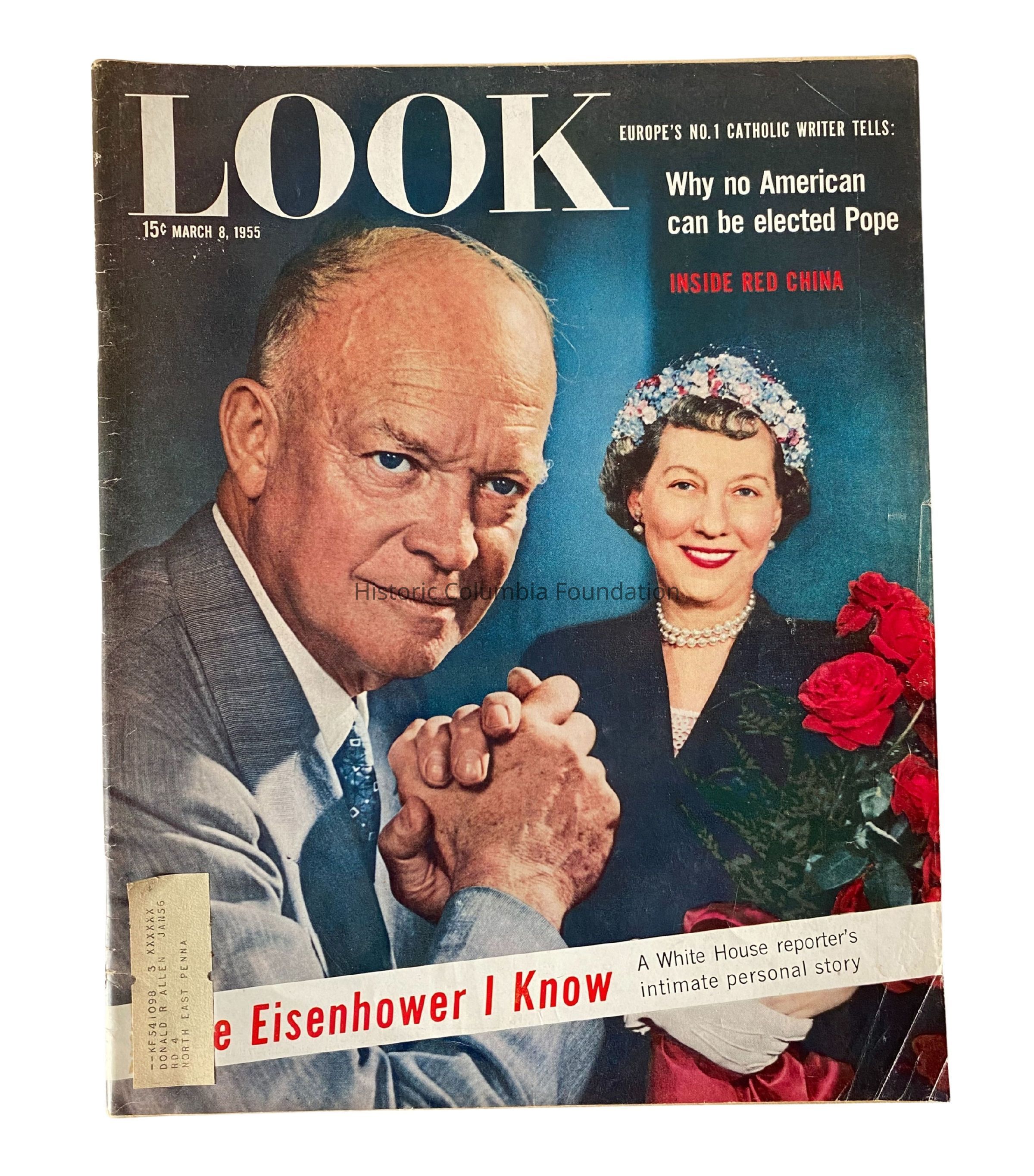"LOOK Magazine." The front cover features President Dwight D. Eisenhower—a white man with thinning blonde hair in a grey suit, white dress shirt, and blue tie—clasping his hands. Behind him in the distance, First Lady Mary Eisenhower—a white woman with short brown curly hair wearing a navy blue suit jacket, pearl necklace, red lipstick, and a floral hat—stands holding a bouquet of red long-stem roses. Against a blue backdrop, the white text reads "LOOK / 15¢ March 8, 1955 / Europe's No. 1 Catholic writer tells: / Why no American / can be elected Pope." Under that in red, it also notes "Inside Red China." Finally, in a white banner across the bottom of the cover, it reads "The Eisenhower I Know / A White House reporter's / intimate personal story." The back cover includes an advertisement for Camel Cigarettes.Publication Details