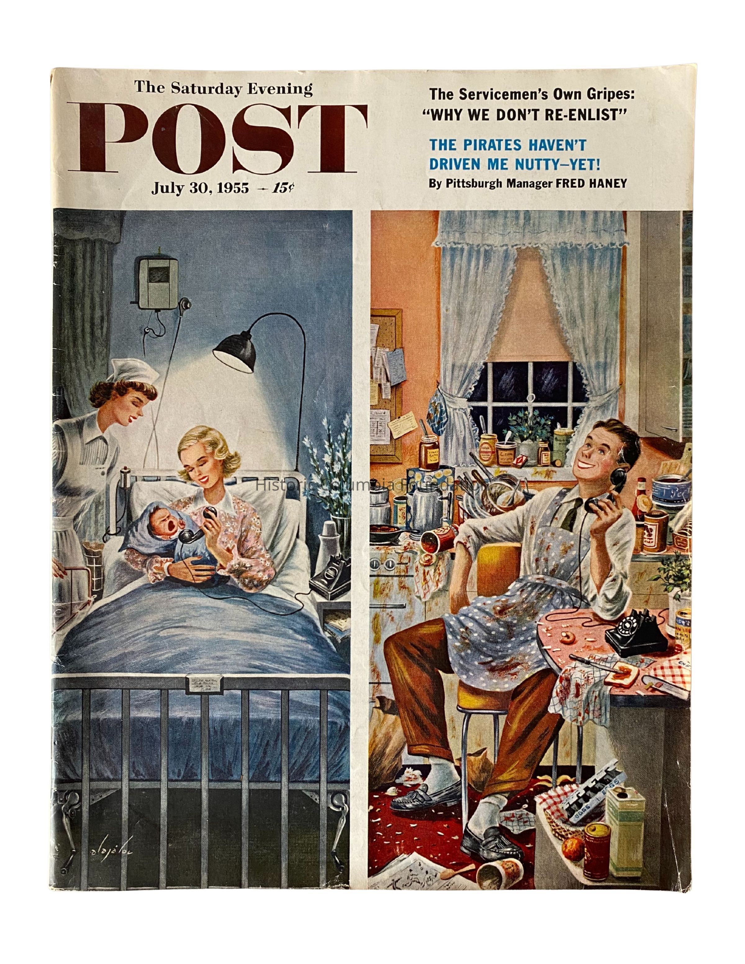 Across the top of the magazine it reads "The Saturday Evening / Post / July 30, 1955 — 15¢,"" along with references to feature articles: "The Servicemen's Own Gripes: / 'Why We Don't Re-Enlist'" and "The Pirates Haven't / Driven Me Nutty—Yet! / By Pittsburgh Manager Fred Haney."Publication Details