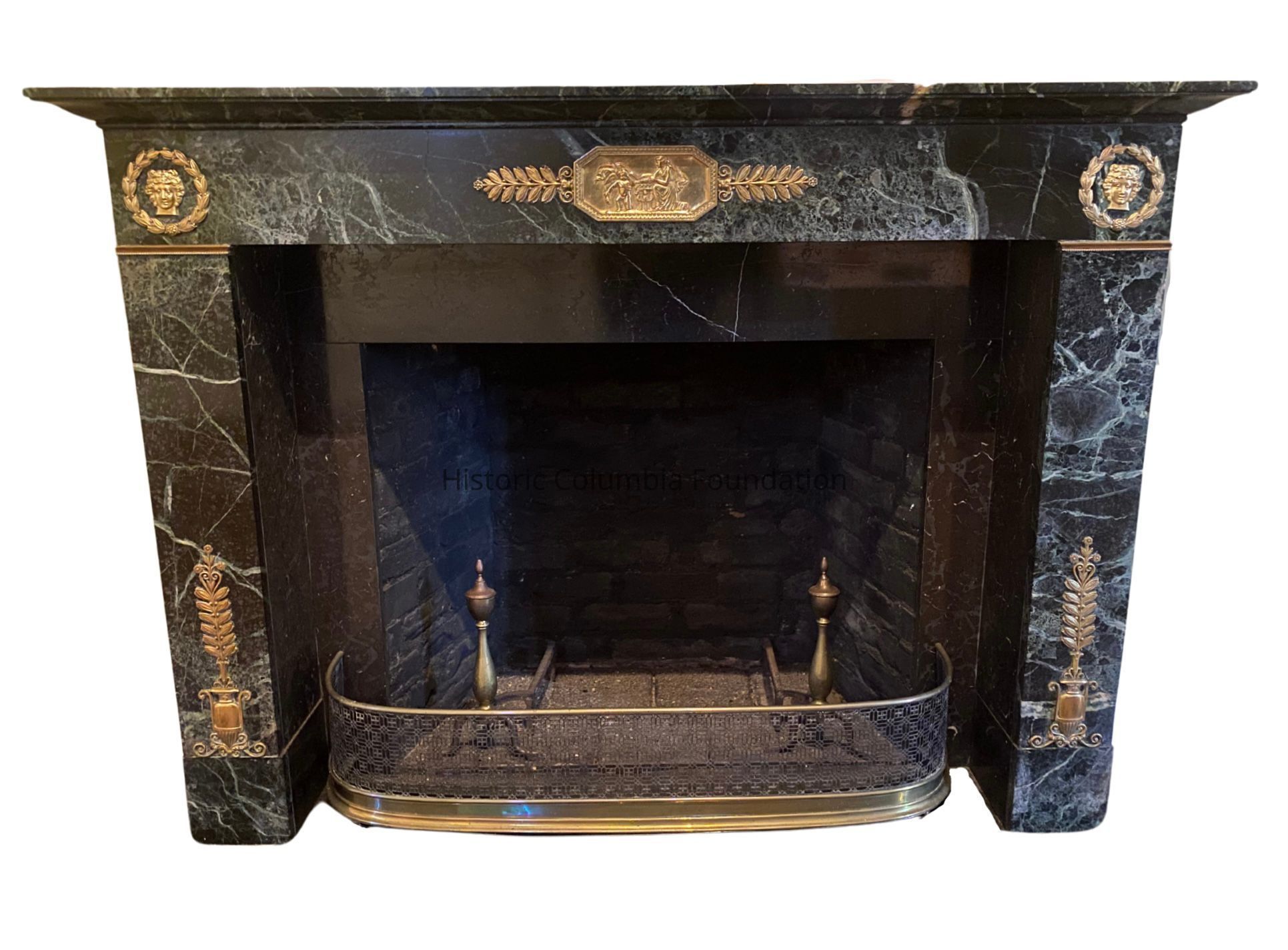 This mantel, as well as three others purchased for the same purpose, replaced the standard wooden mantels that once surrounded the fireplaces on the main floor of the Robert Mills House. The home was intended for Sarah (1791–1867) and Ainsley Hall (1783–1823), yet they never lived in the house. Because the Halls did not make the final selections for certain interior aspects of the home, such as chandeliers and mantels, the house lacked grand adornments suitable for a wealthy merchant like Ainsley Hall. Instead, when the construction of the house was completed, simple mantels and light sources were installed. These nonetheless functioned well for the three religious schools that later operated in the building.