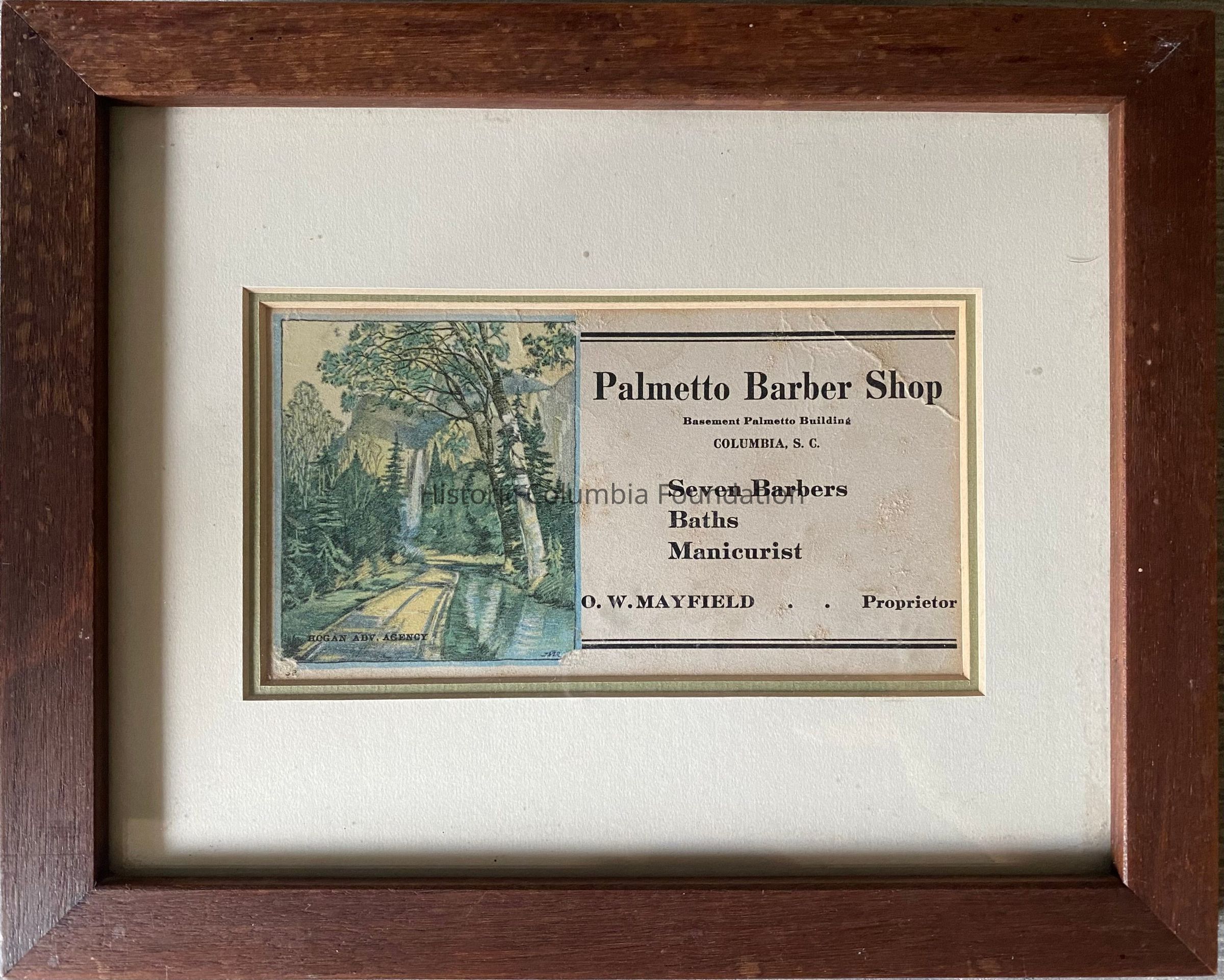 The Palmetto Barber Shop was operated by Oliver Mayfield, Sr. (1889–1961) for nearly 20 years. Born in Spartanburg, South Carolina as one of 12 children, Mayfield settled in Columbia before marrying Annie Newton (1895–1988) in 1913. City directories indicate that Mayfield worked as a barber at the Jerome Hotel Barber Shop under James M. Kirby from 1914 to 1916. Kirby, who owned a residence at 1214 Lady Street, hosted the Mayfields, another Jerome Hotel Barber Shop employee, and at least two other residents.