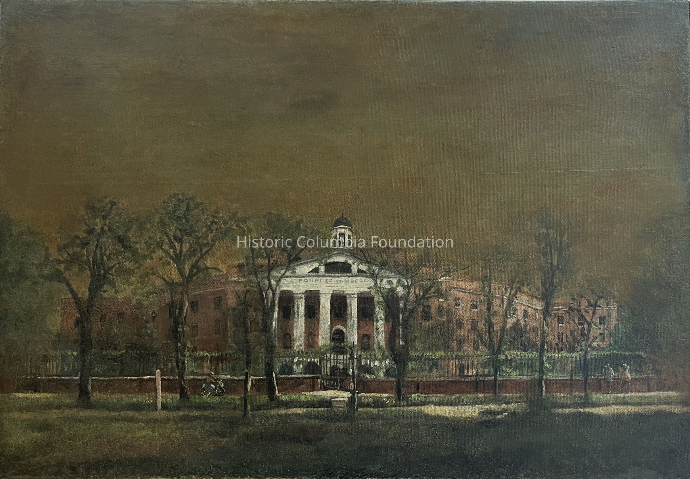 A post factum inscription on the reverse of the canvas suggests that the painting was completed around 1857—not long after another depiction of the campus was produced by Columbia-based artist Eugene Dovilliers (1818–1887) and published in the asylum's annual report. However, the bicyclist and a couple dressed in more contemporary garb, which were revealed during recent conservation efforts, support a later attribution.Made/Created
