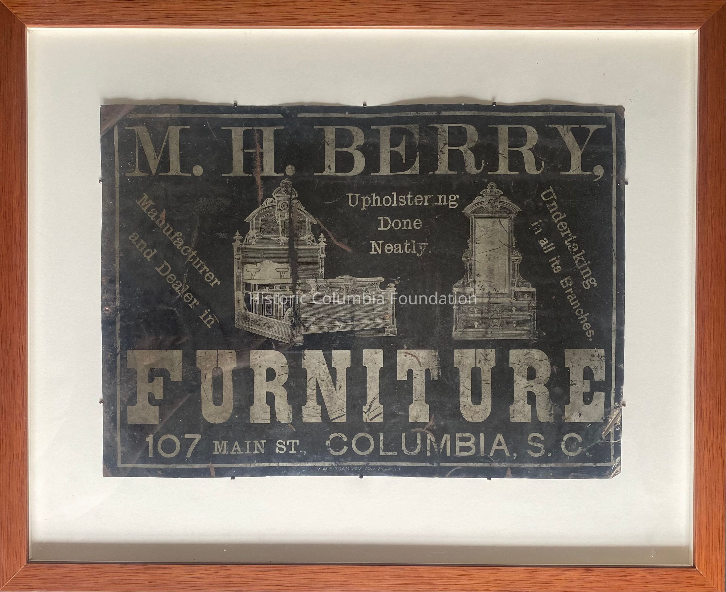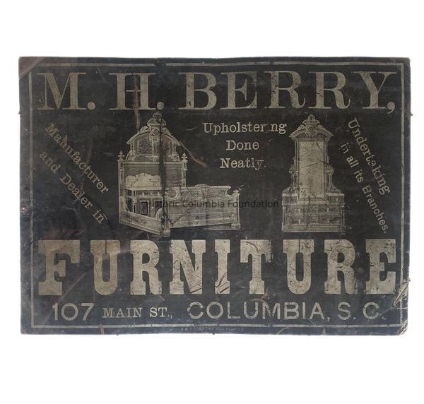Metal black sign with off-white print and depictions. The sign advertises M.H. Berry's furniture business in Columbia at 107 Main Street. Additional script reads "Manufacturer and Dealer in Furniture. Upholstering Done Neatly. Undertaking in all its Branches." There are images of an ornate bed frame containing a washstand, as well as a large ornate vanity.Context