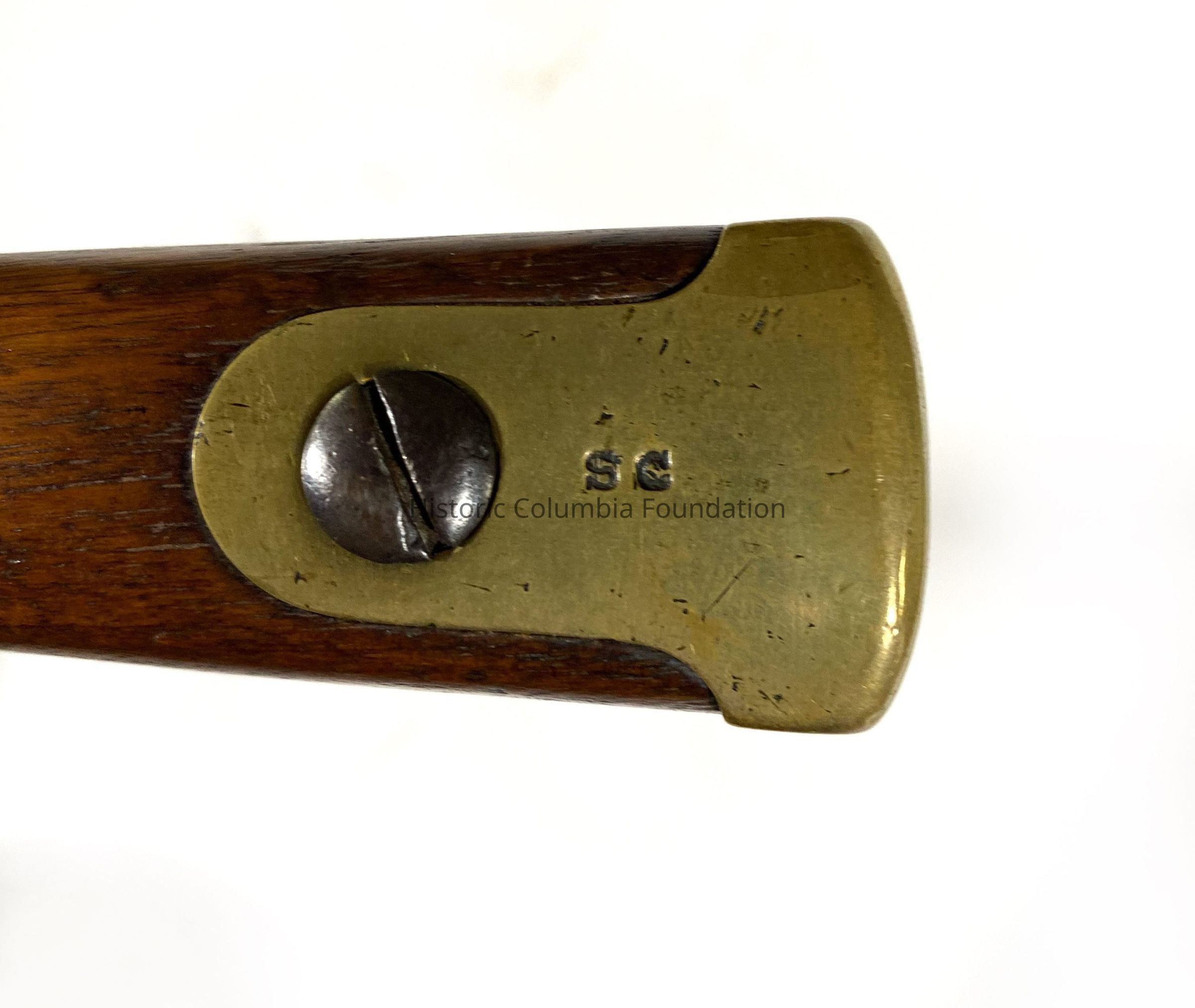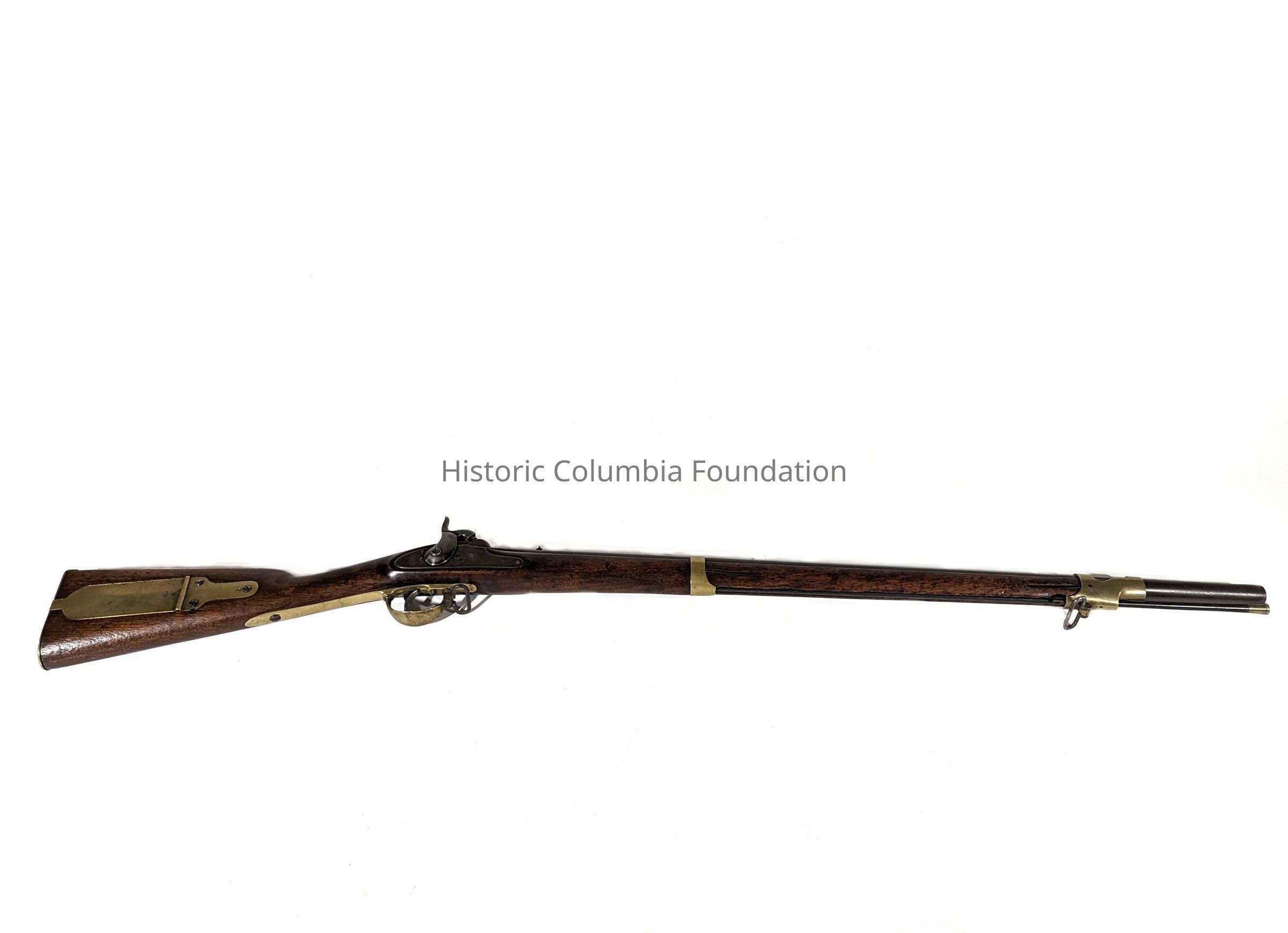 Wooden and metal rifle with brass furniture and ramrod. There are two oval shape rings for option to attach a strap on the bottom of the rifle. The lock plate is stamped with "Palmetto Armory SC" encircling a palmetto tree. "Columbia, S.C. 1853" is also stamped on the lock plate directly over the trigger. The barrel is engraved with a "P" over a "V" and on the side of the ramrod. "SC" is engraved on the tang.Firearm Type