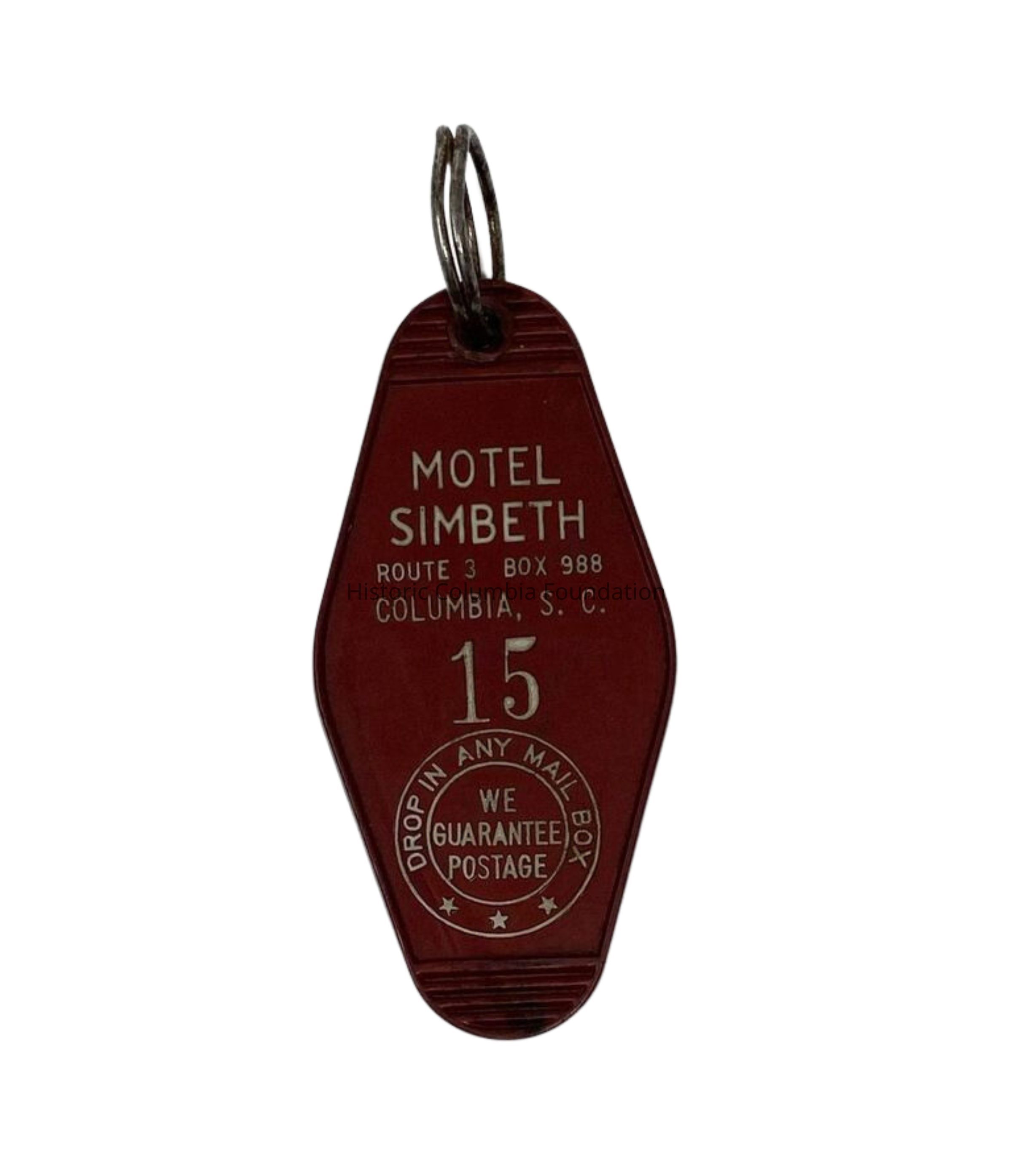 Red key fob with silver jump ring. In white lettering on the front, it reads: "Motel Simbeth, Route 3 Box 988, Columbia, S.C., 15, Drop in any mail box, we guarantee postage.” It is plain on the back.Use