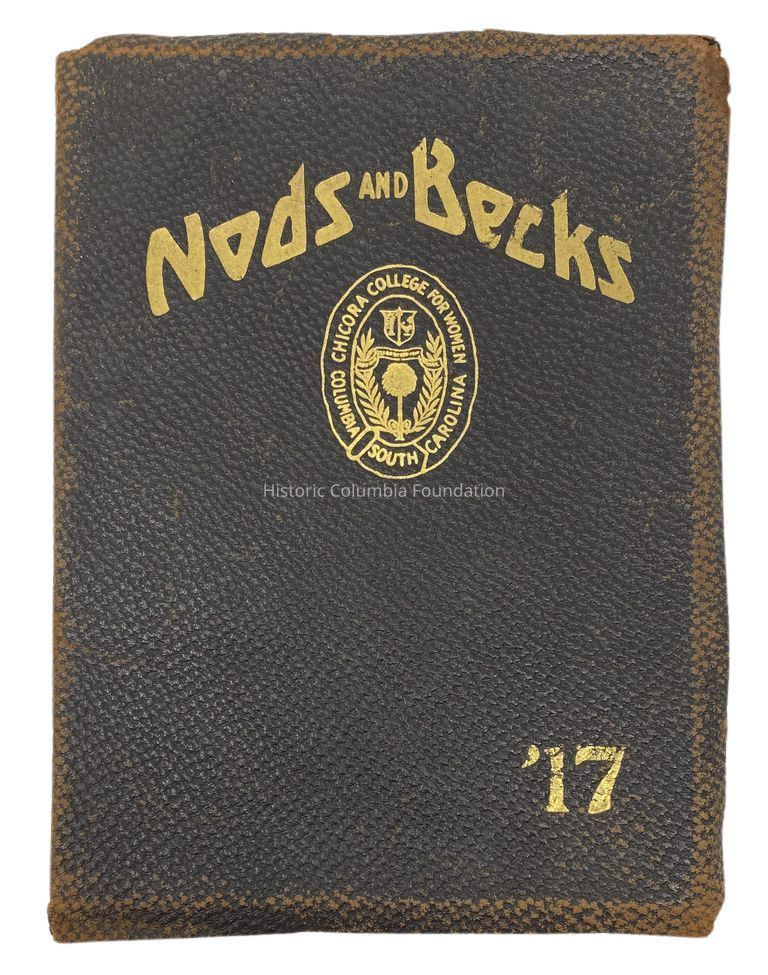 Black leather cover book with gold writing. The cover contains a seal for "Chicora College for Woman" in the center with "Nods and Becks" above and "'17" in the bottom left corner. The interior pages contain images of young women during their college years as well as images of the Hampton-Preston Mansion and grounds. There are also advertisements for Columbia businesses on the last few pages.Context